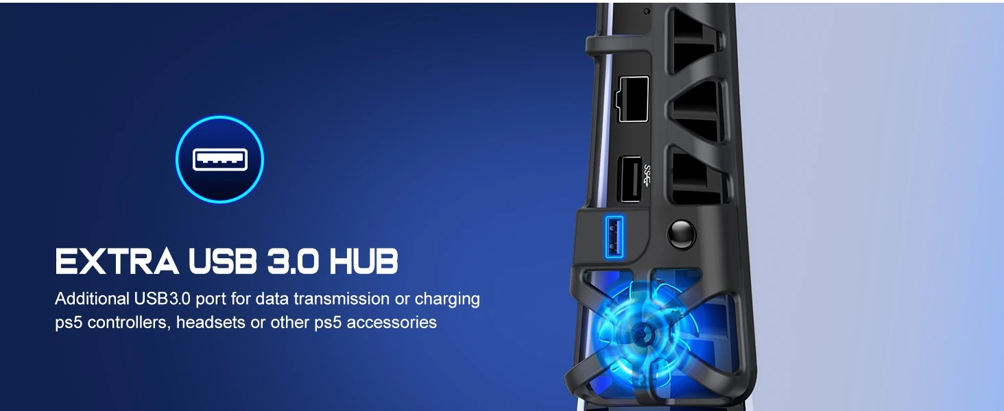 ✅【Plug and Play y Puerto USB 3,0 extra】 ¡El ventilador de refrigeración ps5 se puede instalar en solo 10 segundos! Simplemente deslice el gancho en la parte superior de la consola ps5 Slim y Conecte el conector USB, y el ventilador ps5 comenzará a funcionar. El ventilador de refrigeración funciona con la consola PS5 Slim sin necesidad de una fuente de alimentación adicional. El ventilador de enfriamiento Delgado ps5 también tiene un puerto USB 3,0 adicional para la transmisión de datos o la carga de controladores ps5, auriculares u otros accesorios ps5. A debe tener accesorios ps5 para los jugadores de ps5.