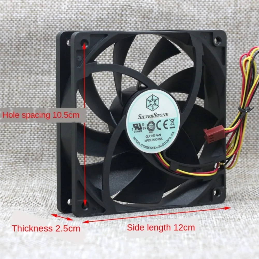 Dimensiones: 120*120*25mmPaso: 10,5 cmVoltaje nominal: 12VCorriente nominal: 0.18APotencia de entrada: 1,44 WVelocidad de rotación: 1000RPM ± 10% (completa)Flujo de aire máximo: 50CFMPresión estática máxima: 58PaRuido: 11DBPeso: 160gLínea: Longitud de interfaz libre 60cmSe recomienda utilizar: Refrigeración del chasis, reemplazo del ventilador de la fuente de alimentación del molino de viento de 12cm y aplicaciones de servidor en la nube altamente confiables.El ventilador es una interfaz de placa base 3P que admite velocidad, función de control de velocidad (solo en la marca en la placa base según la temperatura, la placa base general insertada directamente en la interfaz de 3 pines funcionará a toda velocidad, muy silencioso).