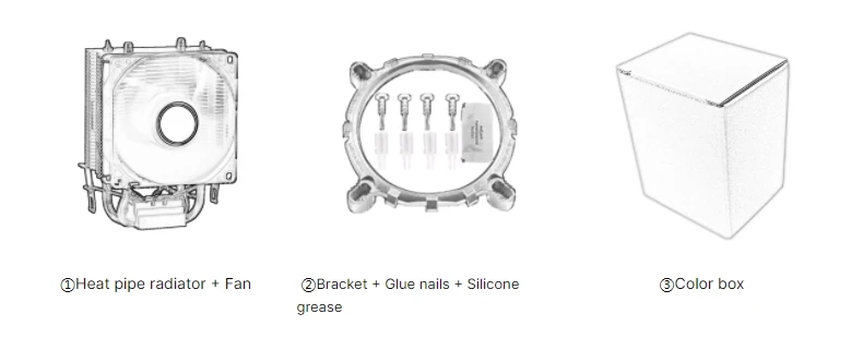 Paquete: Caja de color (refrigerador de CPU*1, soporte de fijación*1 kit, grasa de silicona*1)