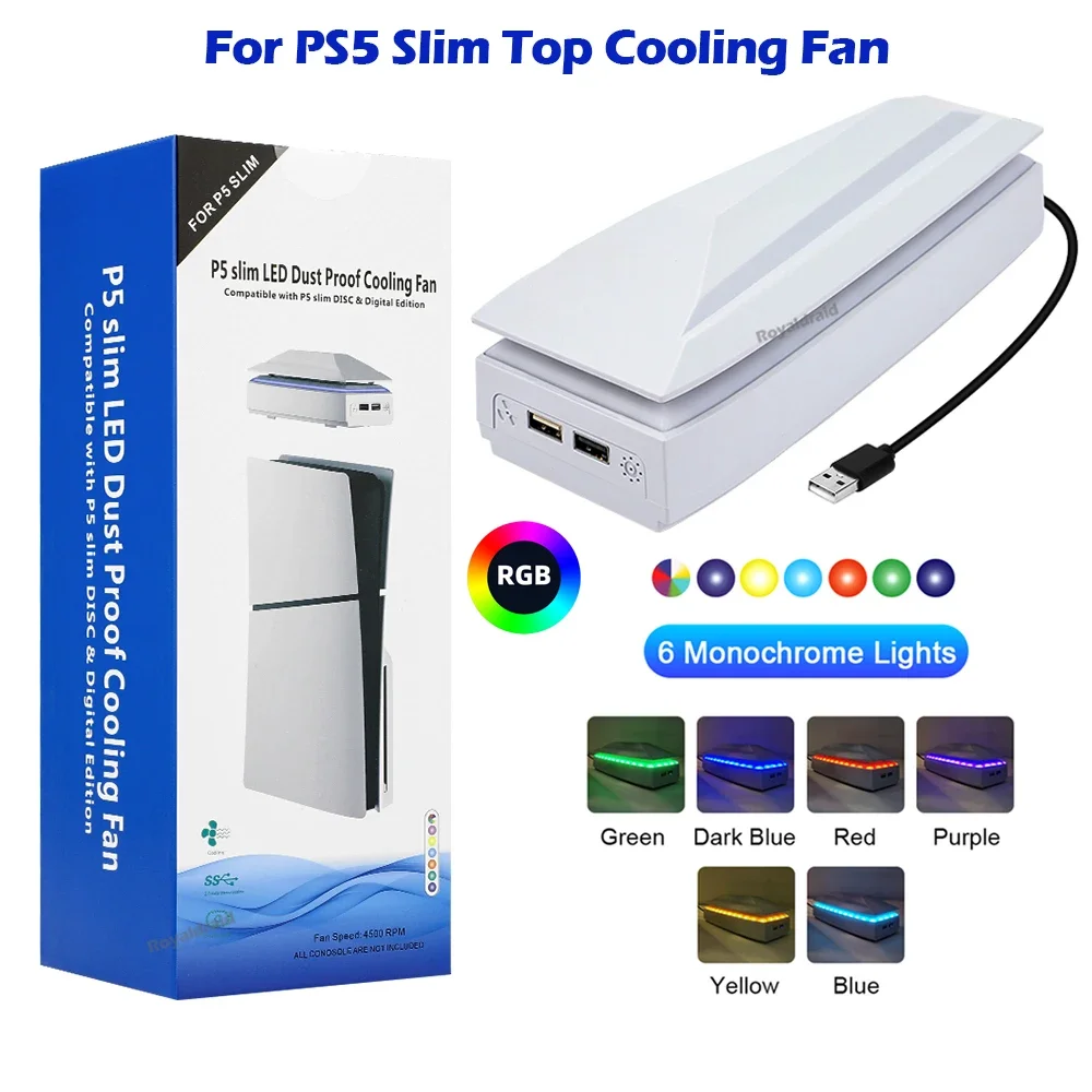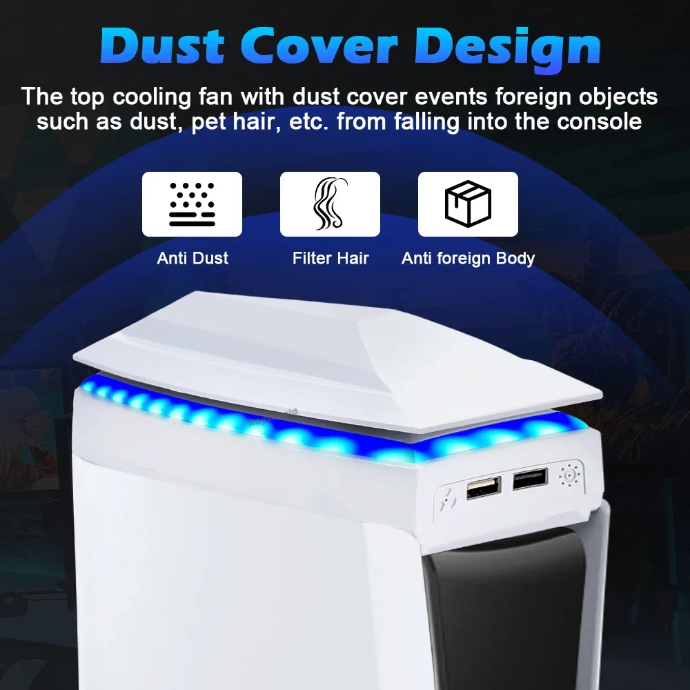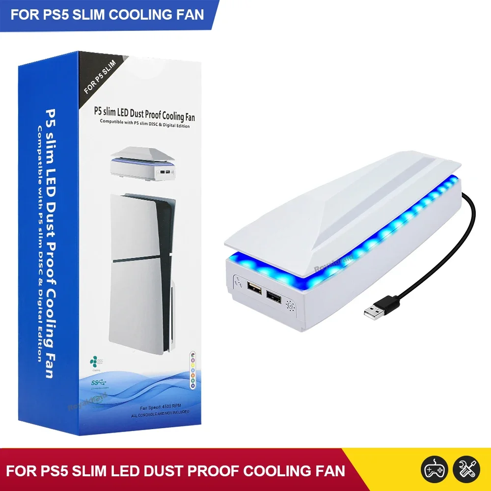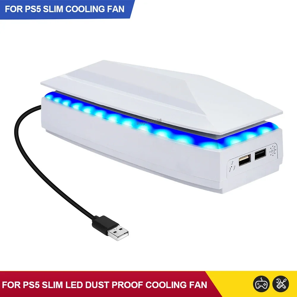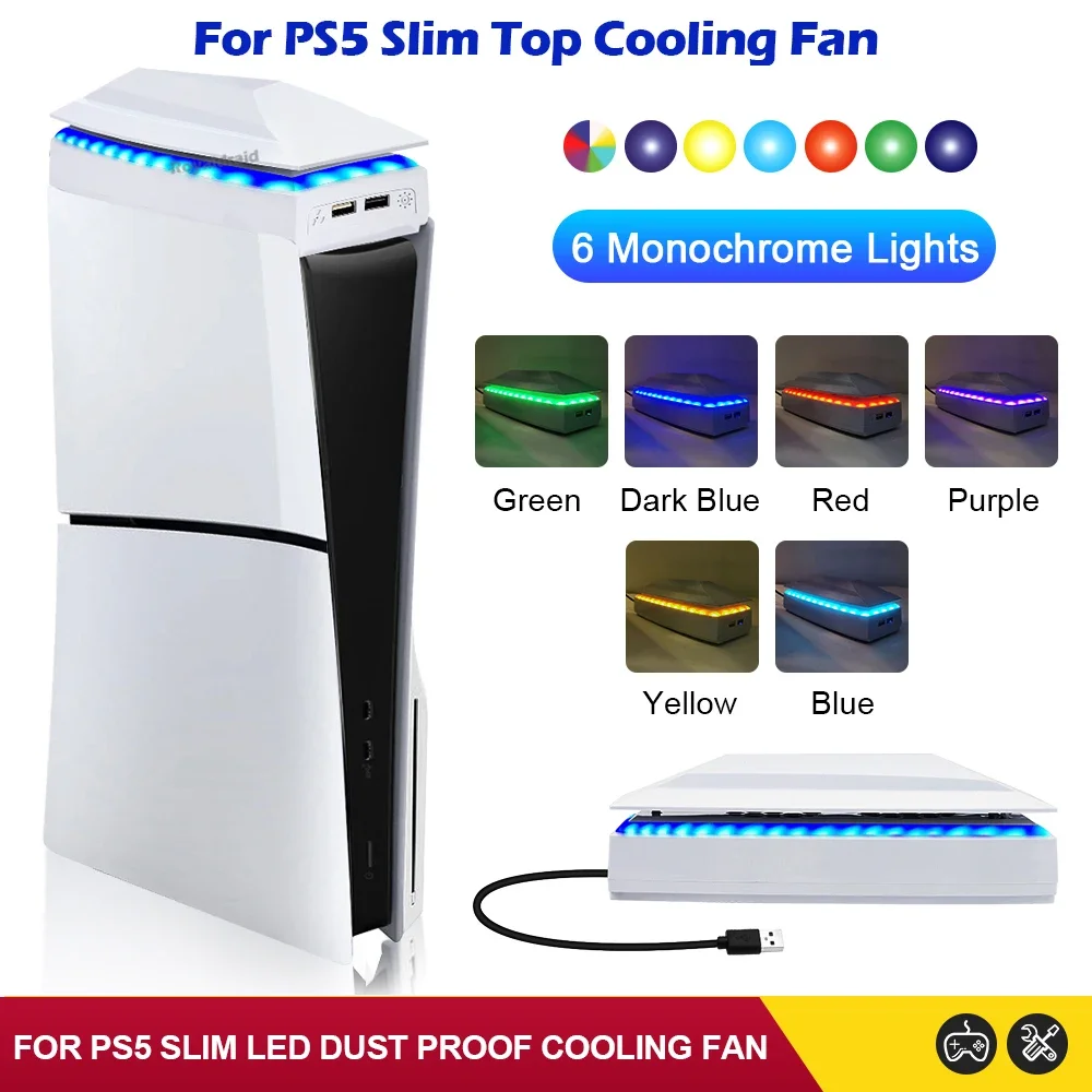 Nueva parte superior para PS5, ventilador de refrigeración de consola delgada, radiador de host de juego a prueba de polvo RGB, ventilador de refrigeración de host externo con luz LED para consola delgada PS5Característica:Compatible con PS5 Slim Disc y Digital Edition ambos.1. Este producto es compatible con las consolas de juegos de la serie P5 SLIM, y el cable de carga USB se puede conectar a la interfaz de salida USB de las consolas de juegos P5 SLIM2. El sistema de refrigeración del ventilador tiene 3 tipos de velocidad de ventilador y un chip inteligente incorporado. Toque el interruptor para cambiar la velocidad a entre baja, media y alta3. El ventilador de refrigeración P5 SLIM optimiza 8 nodos de iluminación LED, incluida la respiración, la respiración rápida y 6 luces monocromáticas (rojo, azul, verde, púrpura de ensueño, azul, amarillo). El color de la luz se puede cambiar a través de un interruptor de luz. Presione brevemente el interruptor para alternar entre 8 efectos de luz y apague la luz. Mantenga presionado el interruptor durante 3 segundos para apagarlo y memorizar el efecto de luz actual. Presione brevemente el interruptor nuevamente para abrir el efecto de luz guardada.4. Hay dos interfaces USB. Ambos puertos USB 2,0 tienen una función de carga, que se puede utilizar para cargar el mango, una pequeña lámpara de escritorio, etc. La interfaz negra también tiene una función de transferencia de datos 2,0, mientras que la interfaz blanca solo admite carga.Instrucciones:1. Instale el ventilador de color superior a prueba de polvo para el host PS5 SLIM y conecte el cable USB del ventilador de refrigeración a la interfaz USB para el host PS5 SLIM.2. Toque el interruptor del ventilador para cambiar entre velocidad de viento baja, media y alta velocidad y apague el ventilador. (Nota: Si se determina que apagar el ventilador no requiere trabajo, la luz RGB también se apagará. Puede encender la luz RGB por separado a través del interruptor de luz; Si presiona prolongadamente el interruptor del ventilador durante 3 segundos, también se apagará el ventilador).3. El producto tiene 8 efectos de iluminación. Presione brevemente el interruptor de efecto de iluminación para alternar entre los 8 efectos de iluminación y apagar los efectos de iluminación. Mantenga presionado el interruptor durante tres segundos para apagar y guardar el efecto de iluminación actual. Pulse brevemente el interruptor de nuevo para activar el efecto de iluminación guardado.Especificación:Aplicación: para consola PS5 SlimColor: BlancoMaterial: ABSPotencia nominal: 12WVoltaje: 5VCorriente: 2,4AVoltaje nominal 5VCorriente nominal 2,4APotencia nominal: 12,5 WPotencia de la linterna: 1,2 WPotencia del ventilador: 0,3 WCorriente de salida total USB * 2: 2,4 ANúmero de revoluciones: 4000 4300 4500Paquete incluido