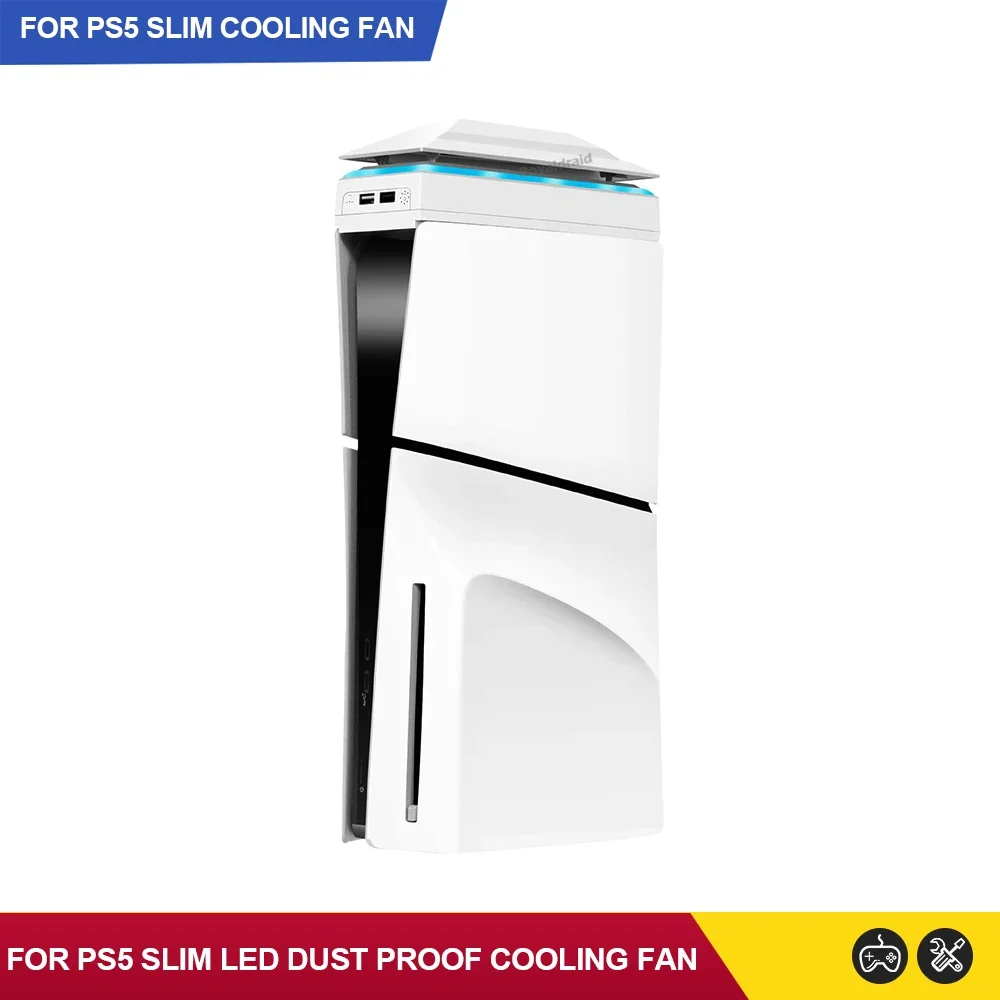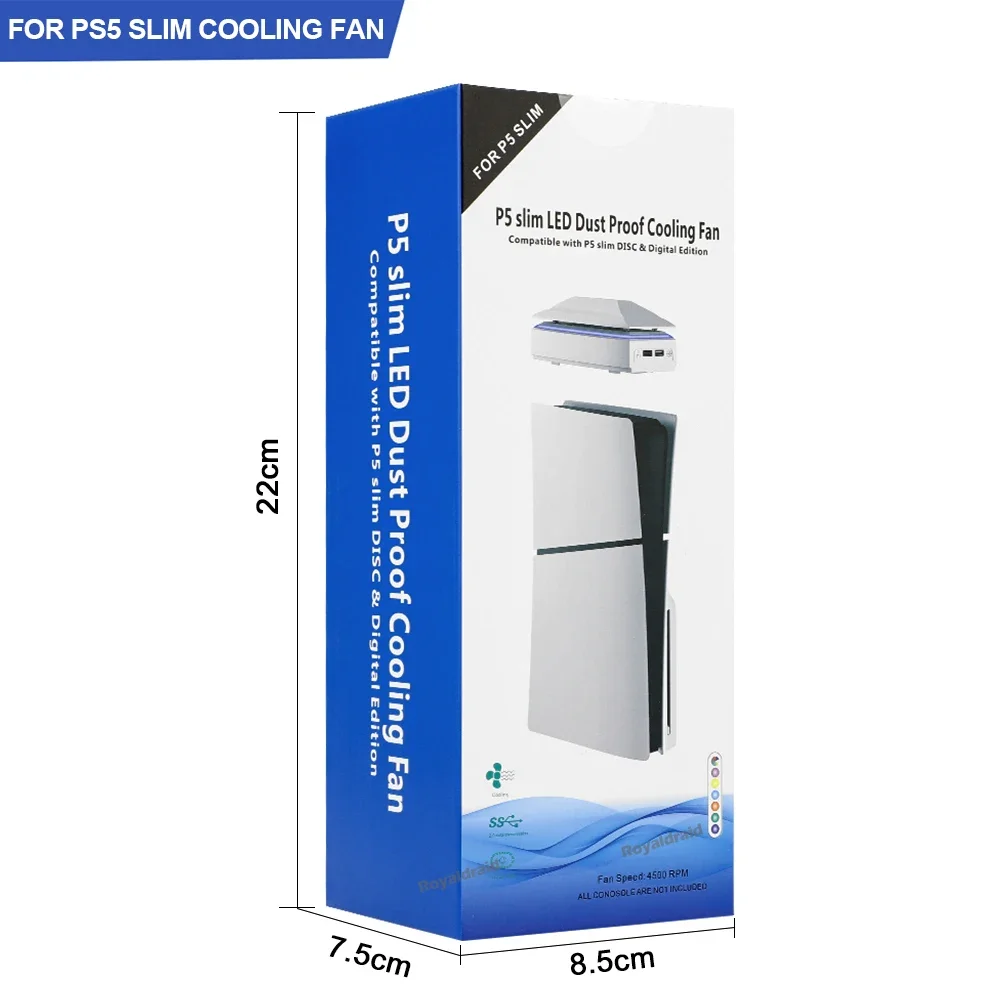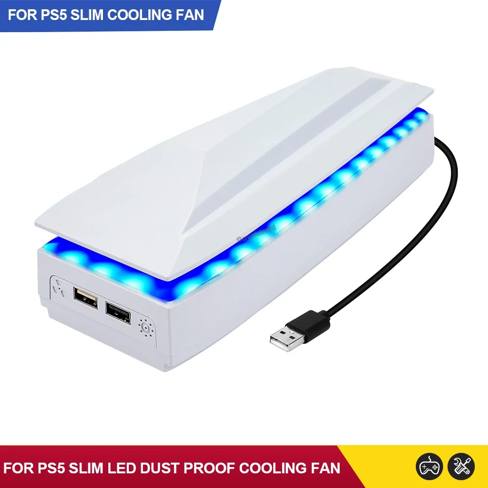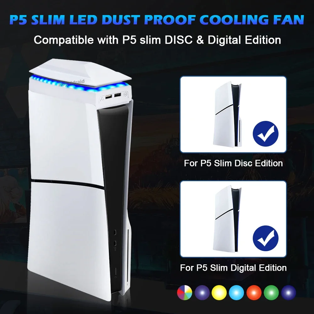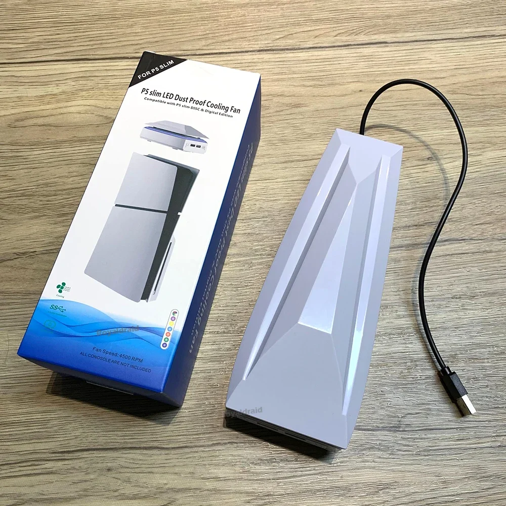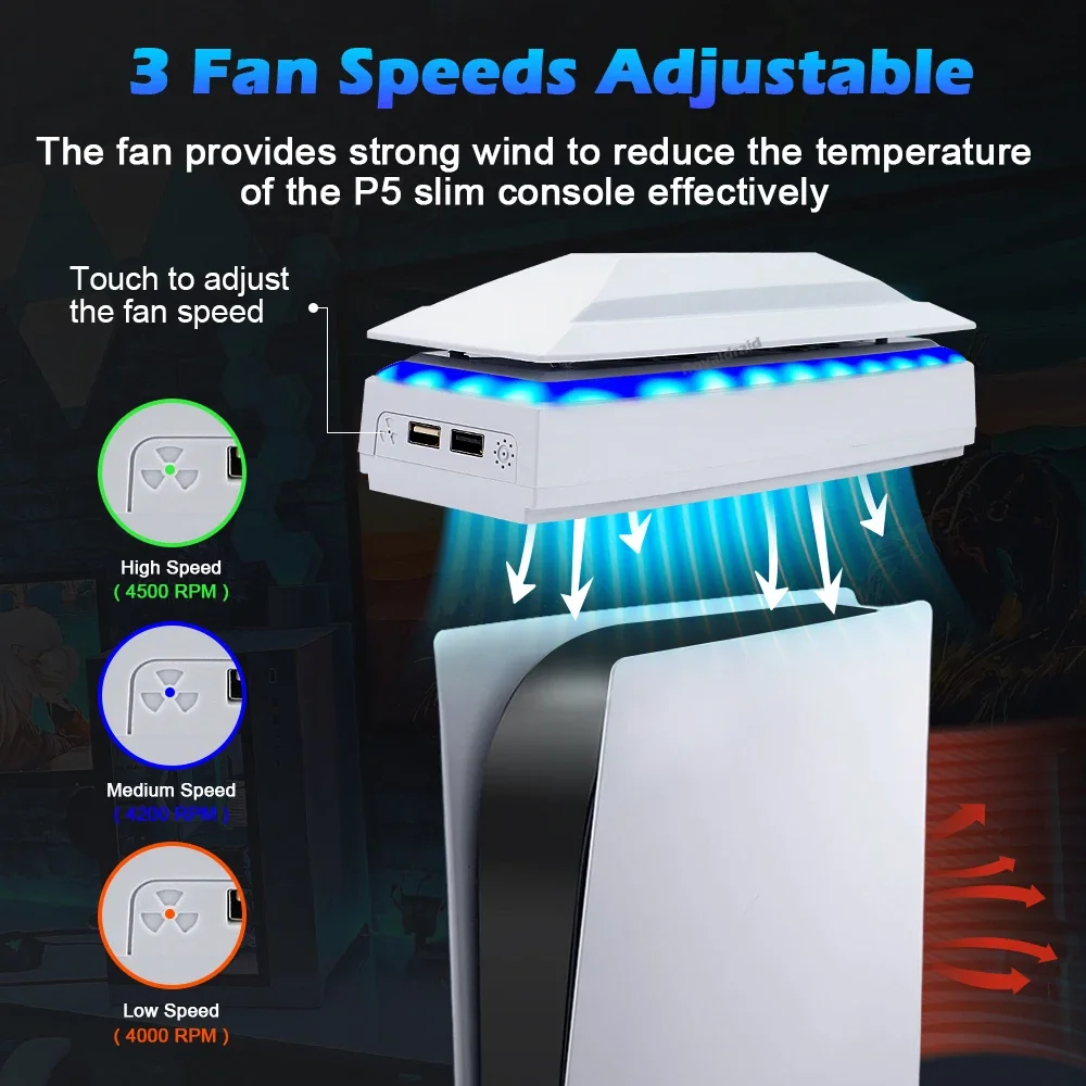 Nueva parte superior para PS5, ventilador de refrigeración de consola delgada, radiador de host de juego a prueba de polvo RGB, ventilador de refrigeración de host externo con luz LED para consola delgada PS5Característica:Compatible con PS5 Slim Disc y Digital Edition ambos.1. Este producto es compatible con las consolas de juegos de la serie P5 SLIM, y el cable de carga USB se puede conectar a la interfaz de salida USB de las consolas de juegos P5 SLIM2. El sistema de refrigeración del ventilador tiene 3 tipos de velocidad de ventilador y un chip inteligente incorporado. Toque el interruptor para cambiar la velocidad a entre baja, media y alta3. El ventilador de refrigeración P5 SLIM optimiza 8 nodos de iluminación LED, incluida la respiración, la respiración rápida y 6 luces monocromáticas (rojo, azul, verde, púrpura de ensueño, azul, amarillo). El color de la luz se puede cambiar a través de un interruptor de luz. Presione brevemente el interruptor para alternar entre 8 efectos de luz y apague la luz. Mantenga presionado el interruptor durante 3 segundos para apagarlo y memorizar el efecto de luz actual. Presione brevemente el interruptor nuevamente para abrir el efecto de luz guardada.4. Hay dos interfaces USB. Ambos puertos USB 2,0 tienen una función de carga, que se puede utilizar para cargar el mango, una pequeña lámpara de escritorio, etc. La interfaz negra también tiene una función de transferencia de datos 2,0, mientras que la interfaz blanca solo admite carga.Instrucciones:1. Instale el ventilador de color superior a prueba de polvo para el host PS5 SLIM y conecte el cable USB del ventilador de refrigeración a la interfaz USB para el host PS5 SLIM.2. Toque el interruptor del ventilador para cambiar entre velocidad de viento baja, media y alta velocidad y apague el ventilador. (Nota: Si se determina que apagar el ventilador no requiere trabajo, la luz RGB también se apagará. Puede encender la luz RGB por separado a través del interruptor de luz; Si presiona prolongadamente el interruptor del ventilador durante 3 segundos, también se apagará el ventilador).3. El producto tiene 8 efectos de iluminación. Presione brevemente el interruptor de efecto de iluminación para alternar entre los 8 efectos de iluminación y apagar los efectos de iluminación. Mantenga presionado el interruptor durante tres segundos para apagar y guardar el efecto de iluminación actual. Pulse brevemente el interruptor de nuevo para activar el efecto de iluminación guardado.Especificación:Aplicación: para consola PS5 SlimColor: BlancoMaterial: ABSPotencia nominal: 12WVoltaje: 5VCorriente: 2,4AVoltaje nominal 5VCorriente nominal 2,4APotencia nominal: 12,5 WPotencia de la linterna: 1,2 WPotencia del ventilador: 0,3 WCorriente de salida total USB * 2: 2,4 ANúmero de revoluciones: 4000 4300 4500Paquete incluido