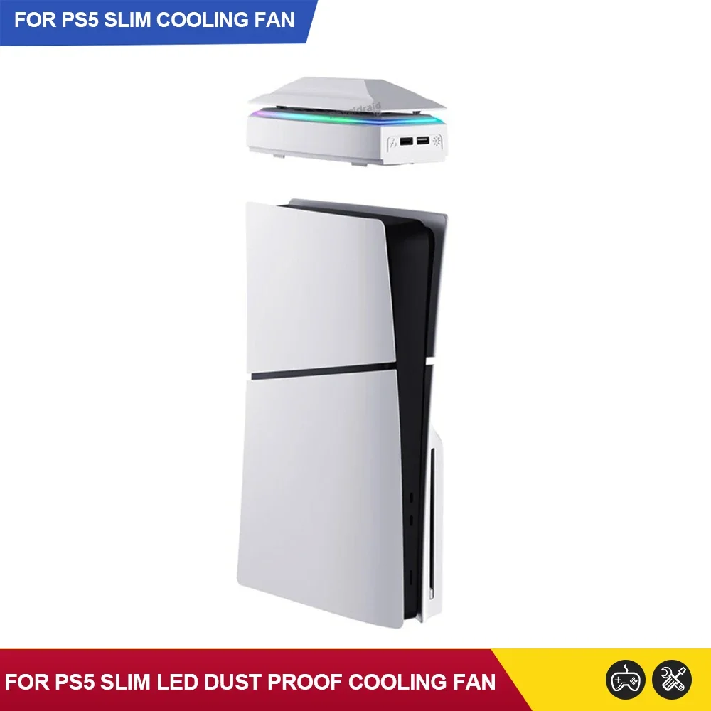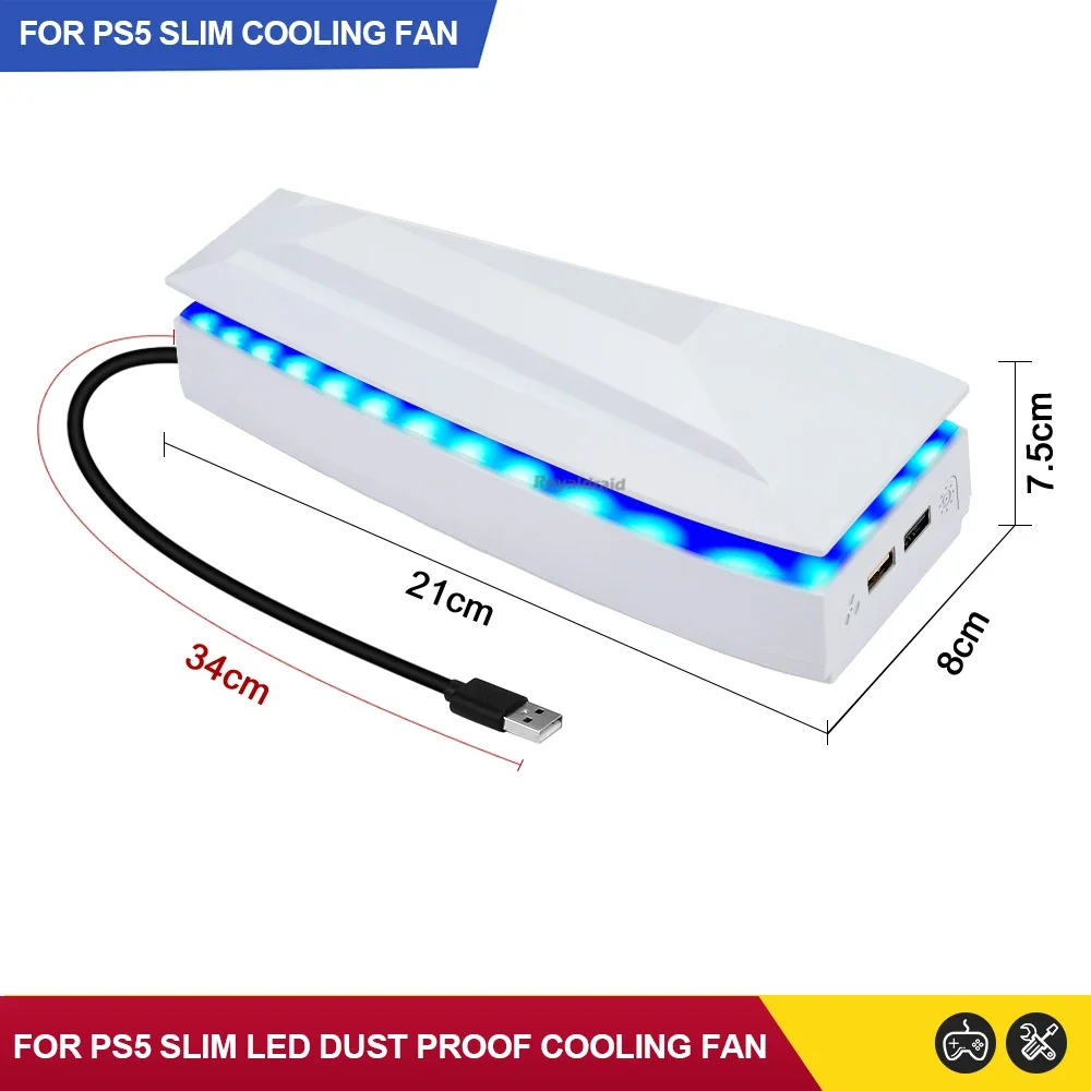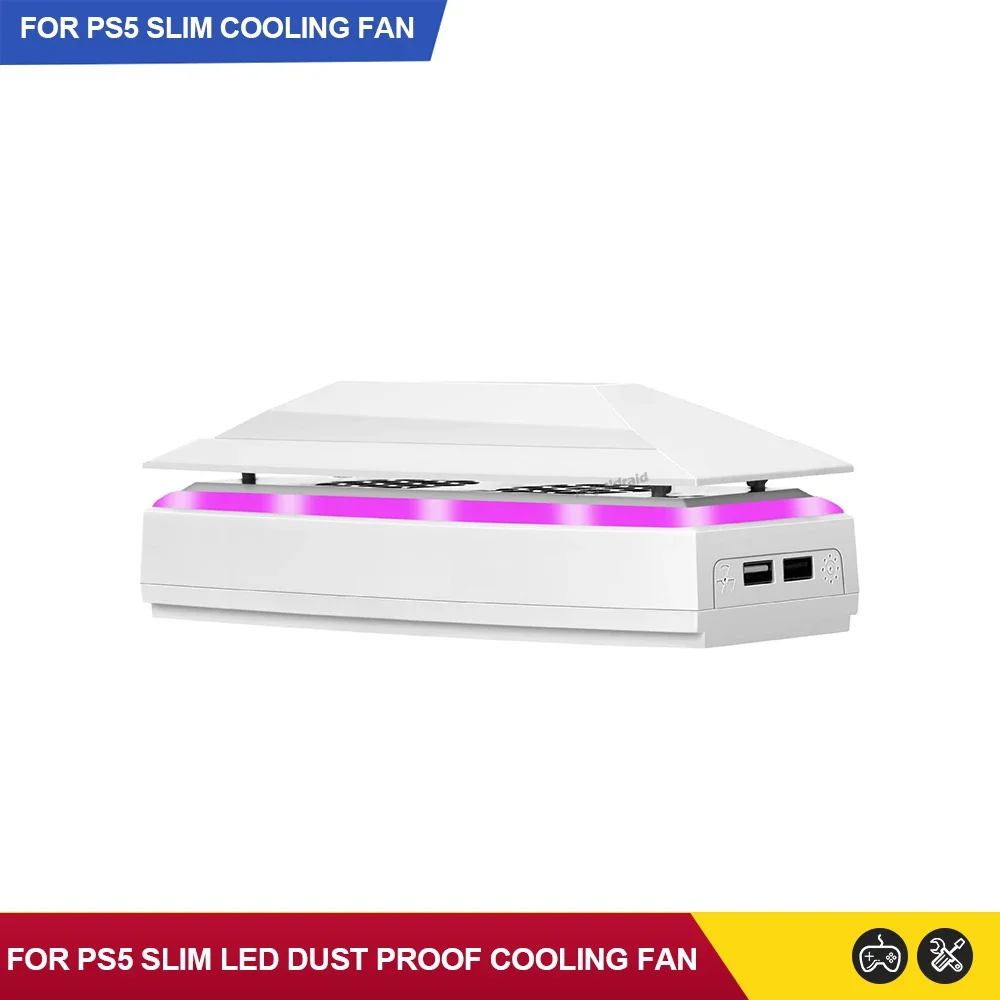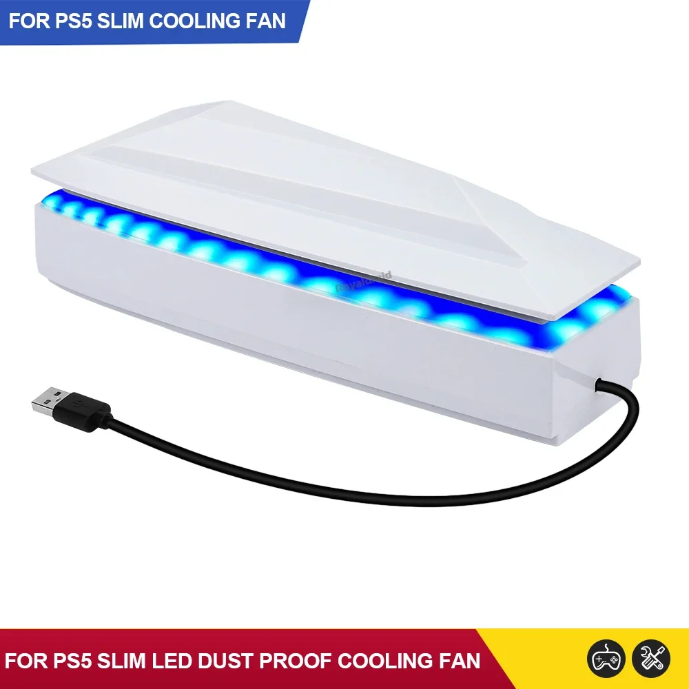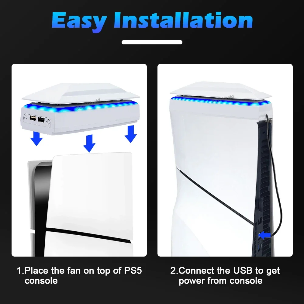 Nueva parte superior para PS5, ventilador de refrigeración de consola delgada, radiador de host de juego a prueba de polvo RGB, ventilador de refrigeración de host externo con luz LED para consola delgada PS5Característica:Compatible con PS5 Slim Disc y Digital Edition ambos.1. Este producto es compatible con las consolas de juegos de la serie P5 SLIM, y el cable de carga USB se puede conectar a la interfaz de salida USB de las consolas de juegos P5 SLIM2. El sistema de refrigeración del ventilador tiene 3 tipos de velocidad de ventilador y un chip inteligente incorporado. Toque el interruptor para cambiar la velocidad a entre baja, media y alta3. El ventilador de refrigeración P5 SLIM optimiza 8 nodos de iluminación LED, incluida la respiración, la respiración rápida y 6 luces monocromáticas (rojo, azul, verde, púrpura de ensueño, azul, amarillo). El color de la luz se puede cambiar a través de un interruptor de luz. Presione brevemente el interruptor para alternar entre 8 efectos de luz y apague la luz. Mantenga presionado el interruptor durante 3 segundos para apagarlo y memorizar el efecto de luz actual. Presione brevemente el interruptor nuevamente para abrir el efecto de luz guardada.4. Hay dos interfaces USB. Ambos puertos USB 2,0 tienen una función de carga, que se puede utilizar para cargar el mango, una pequeña lámpara de escritorio, etc. La interfaz negra también tiene una función de transferencia de datos 2,0, mientras que la interfaz blanca solo admite carga.Instrucciones:1. Instale el ventilador de color superior a prueba de polvo para el host PS5 SLIM y conecte el cable USB del ventilador de refrigeración a la interfaz USB para el host PS5 SLIM.2. Toque el interruptor del ventilador para cambiar entre velocidad de viento baja, media y alta velocidad y apague el ventilador. (Nota: Si se determina que apagar el ventilador no requiere trabajo, la luz RGB también se apagará. Puede encender la luz RGB por separado a través del interruptor de luz; Si presiona prolongadamente el interruptor del ventilador durante 3 segundos, también se apagará el ventilador).3. El producto tiene 8 efectos de iluminación. Presione brevemente el interruptor de efecto de iluminación para alternar entre los 8 efectos de iluminación y apagar los efectos de iluminación. Mantenga presionado el interruptor durante tres segundos para apagar y guardar el efecto de iluminación actual. Pulse brevemente el interruptor de nuevo para activar el efecto de iluminación guardado.Especificación:Aplicación: para consola PS5 SlimColor: BlancoMaterial: ABSPotencia nominal: 12WVoltaje: 5VCorriente: 2,4AVoltaje nominal 5VCorriente nominal 2,4APotencia nominal: 12,5 WPotencia de la linterna: 1,2 WPotencia del ventilador: 0,3 WCorriente de salida total USB * 2: 2,4 ANúmero de revoluciones: 4000 4300 4500Paquete incluido