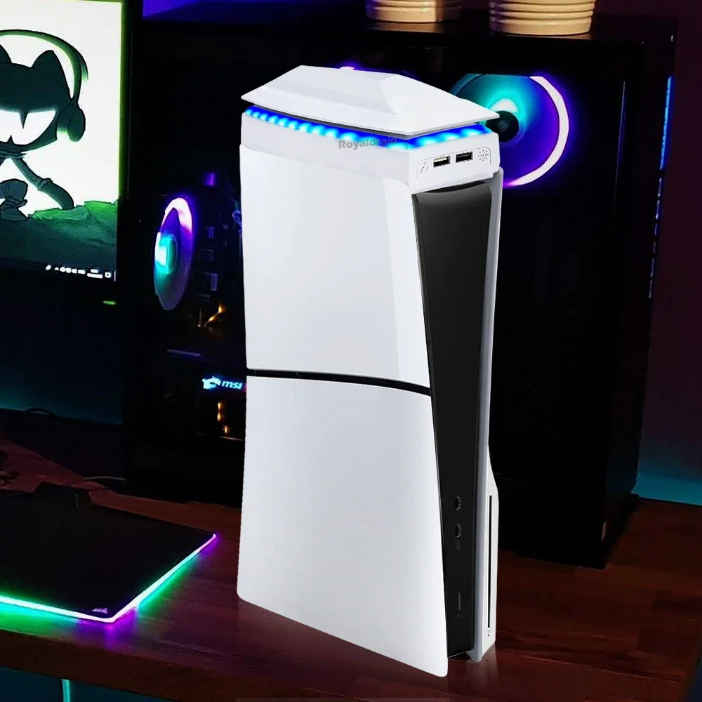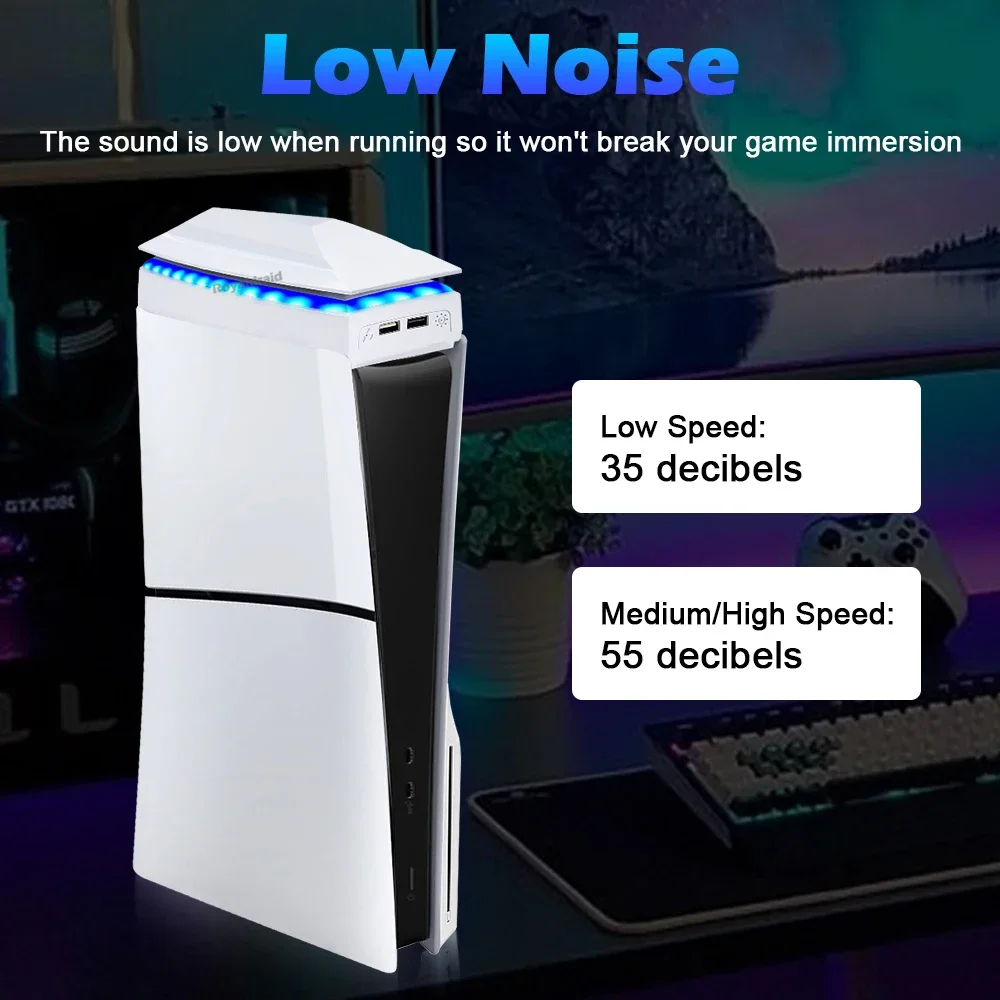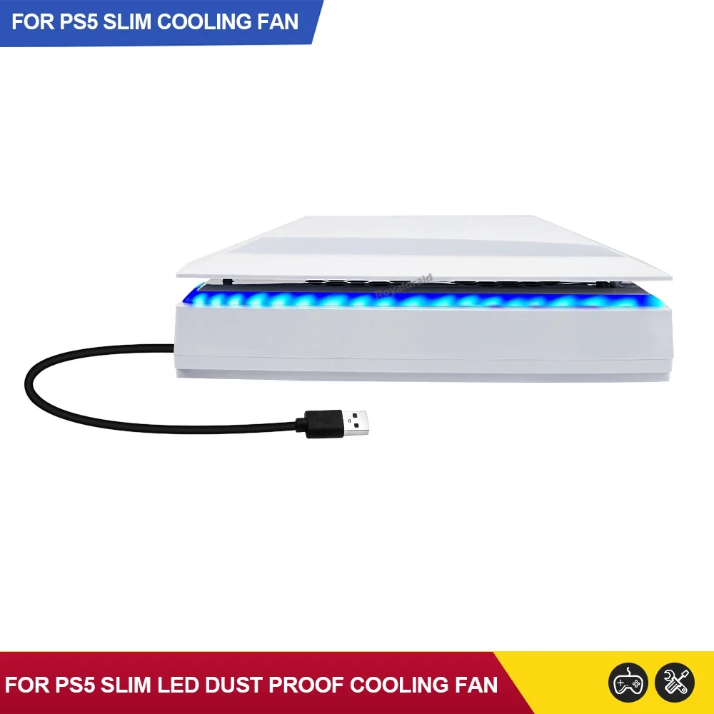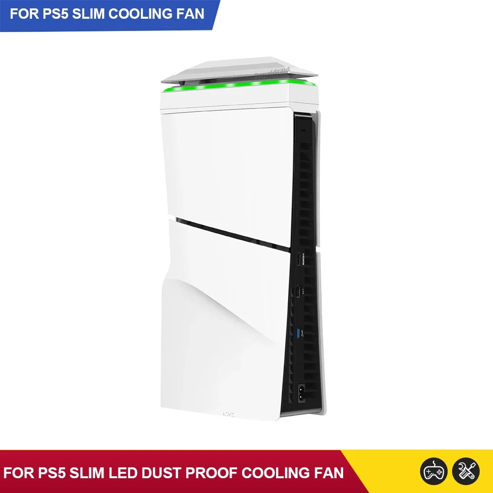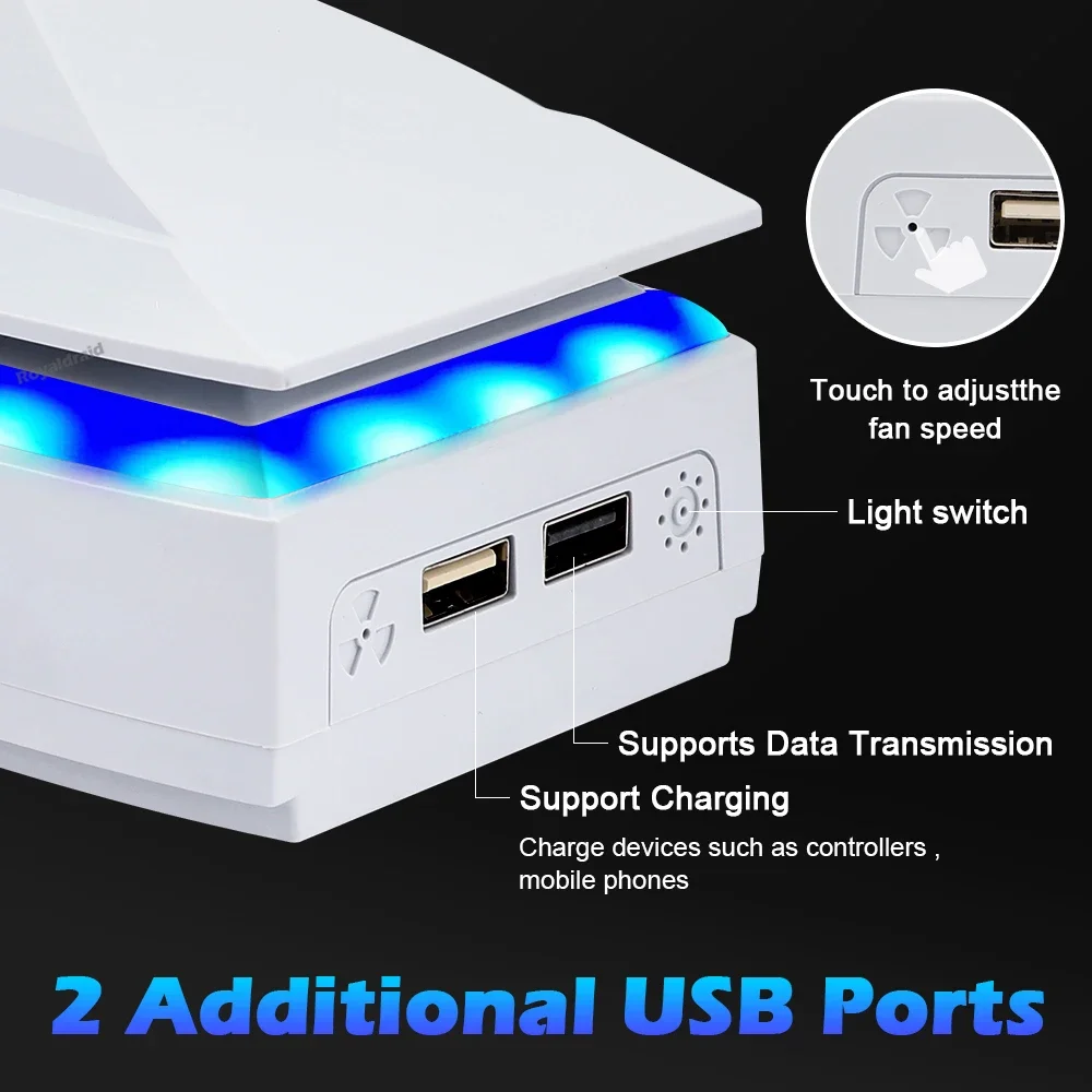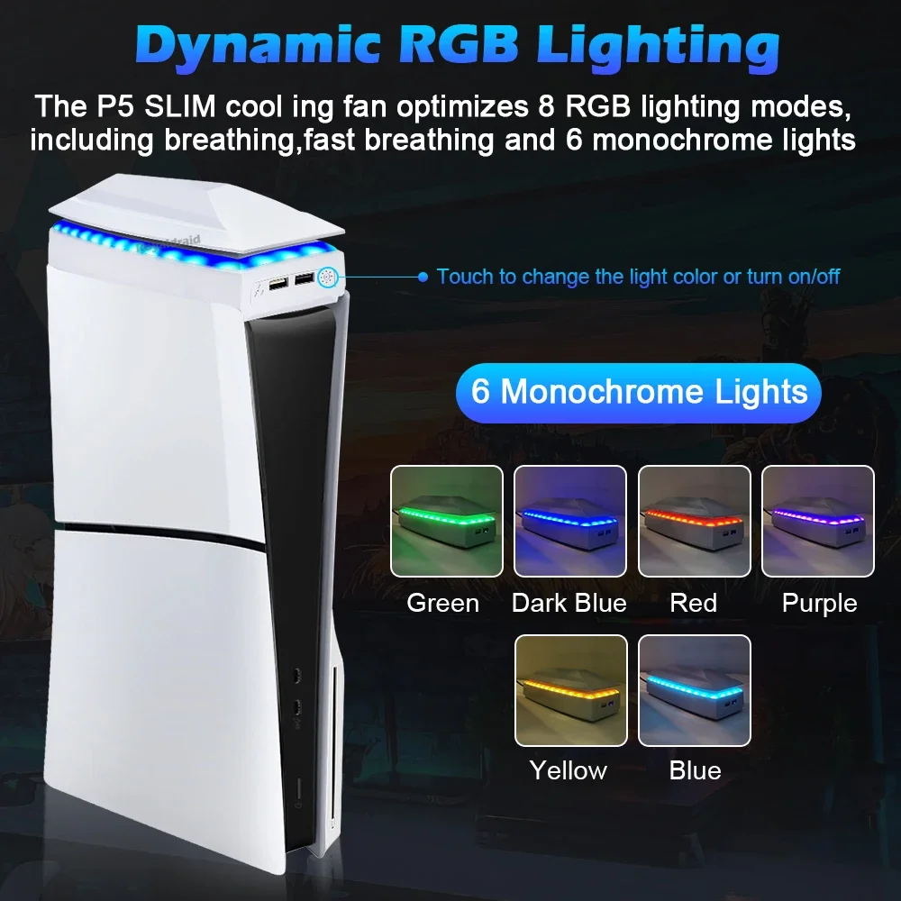 Nueva parte superior para PS5, ventilador de refrigeración de consola delgada, radiador de host de juego a prueba de polvo RGB, ventilador de refrigeración de host externo con luz LED para consola delgada PS5Característica:Compatible con PS5 Slim Disc y Digital Edition ambos.1. Este producto es compatible con las consolas de juegos de la serie P5 SLIM, y el cable de carga USB se puede conectar a la interfaz de salida USB de las consolas de juegos P5 SLIM2. El sistema de refrigeración del ventilador tiene 3 tipos de velocidad de ventilador y un chip inteligente incorporado. Toque el interruptor para cambiar la velocidad a entre baja, media y alta3. El ventilador de refrigeración P5 SLIM optimiza 8 nodos de iluminación LED, incluida la respiración, la respiración rápida y 6 luces monocromáticas (rojo, azul, verde, púrpura de ensueño, azul, amarillo). El color de la luz se puede cambiar a través de un interruptor de luz. Presione brevemente el interruptor para alternar entre 8 efectos de luz y apague la luz. Mantenga presionado el interruptor durante 3 segundos para apagarlo y memorizar el efecto de luz actual. Presione brevemente el interruptor nuevamente para abrir el efecto de luz guardada.4. Hay dos interfaces USB. Ambos puertos USB 2,0 tienen una función de carga, que se puede utilizar para cargar el mango, una pequeña lámpara de escritorio, etc. La interfaz negra también tiene una función de transferencia de datos 2,0, mientras que la interfaz blanca solo admite carga.Instrucciones:1. Instale el ventilador de color superior a prueba de polvo para el host PS5 SLIM y conecte el cable USB del ventilador de refrigeración a la interfaz USB para el host PS5 SLIM.2. Toque el interruptor del ventilador para cambiar entre velocidad de viento baja, media y alta velocidad y apague el ventilador. (Nota: Si se determina que apagar el ventilador no requiere trabajo, la luz RGB también se apagará. Puede encender la luz RGB por separado a través del interruptor de luz; Si presiona prolongadamente el interruptor del ventilador durante 3 segundos, también se apagará el ventilador).3. El producto tiene 8 efectos de iluminación. Presione brevemente el interruptor de efecto de iluminación para alternar entre los 8 efectos de iluminación y apagar los efectos de iluminación. Mantenga presionado el interruptor durante tres segundos para apagar y guardar el efecto de iluminación actual. Pulse brevemente el interruptor de nuevo para activar el efecto de iluminación guardado.Especificación:Aplicación: para consola PS5 SlimColor: BlancoMaterial: ABSPotencia nominal: 12WVoltaje: 5VCorriente: 2,4AVoltaje nominal 5VCorriente nominal 2,4APotencia nominal: 12,5 WPotencia de la linterna: 1,2 WPotencia del ventilador: 0,3 WCorriente de salida total USB * 2: 2,4 ANúmero de revoluciones: 4000 4300 4500Paquete incluido