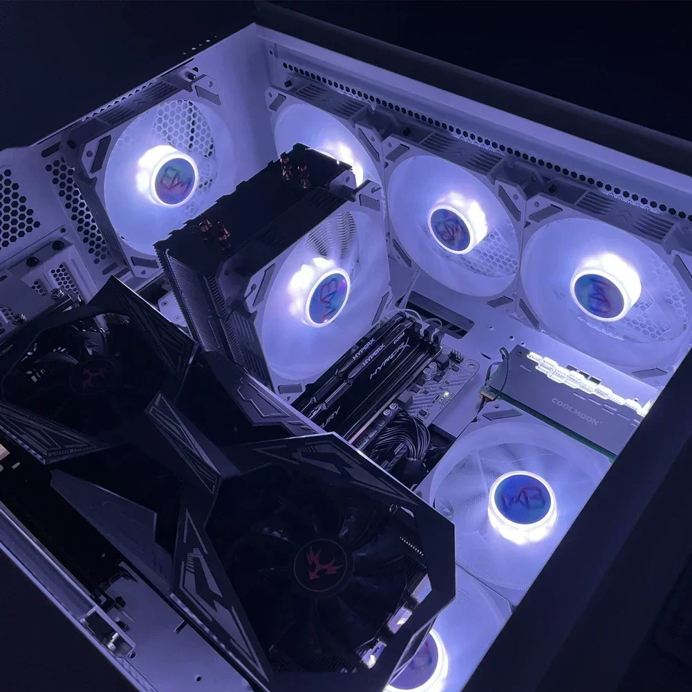 4.Admite placas base ARGB de 5V3 pines como ASUS, MSI, Gigabyte, ASRock, etc., mediante control de software de sincronización de iluminación del ventilador; Admite 16 millones de colores programables.