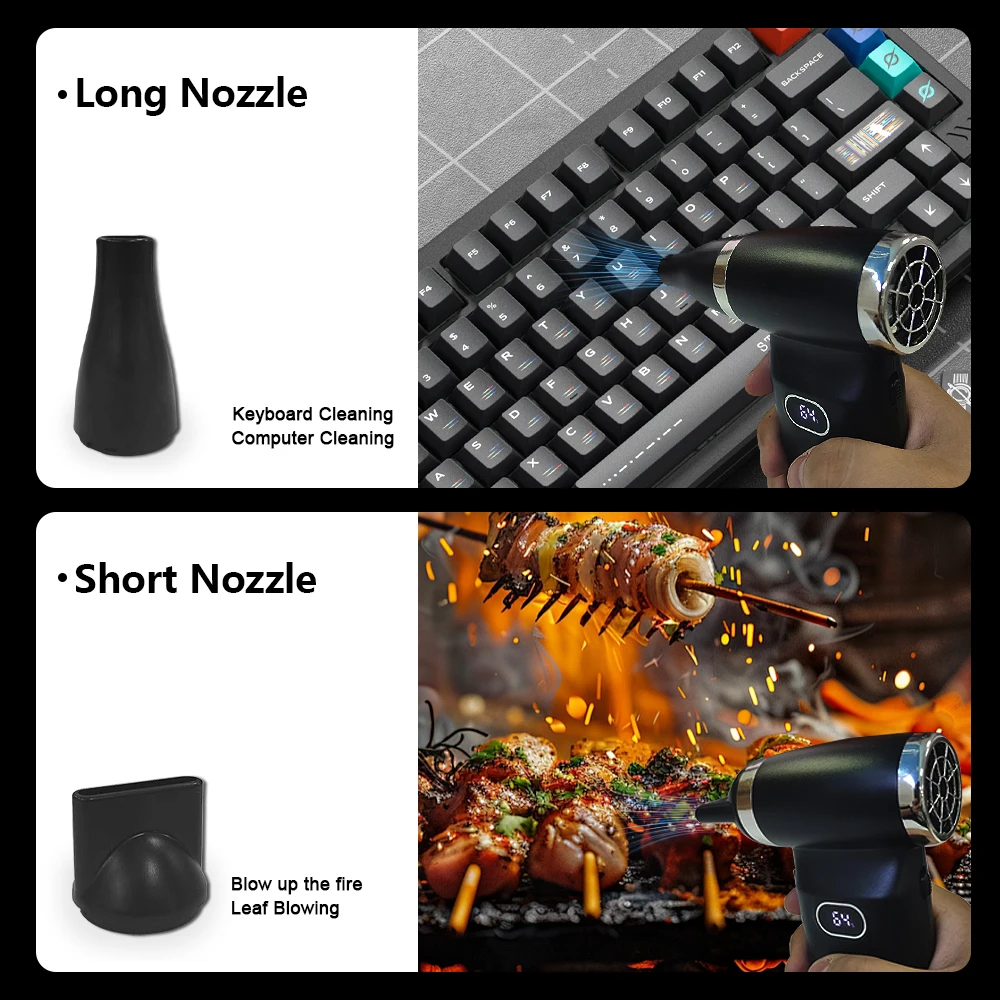 El ajuste de velocidad está disponible, dos boquillas incluidas: redonda y plana. Sopla con confianza. Es malo que cada vez que Enciendes el Modo 1 y tienes que subir manualmente la potencia cada vez, no hay memoria