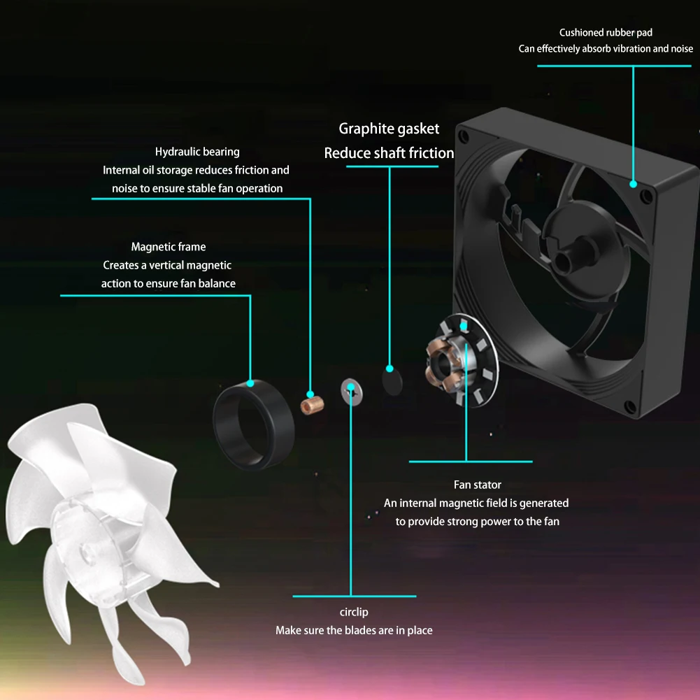 4.Fuerte flujo de aire:Con una impresionante presión de aire de 1,98 mmH2O y una capacidad de flujo de aire de 32,77 CFM, este ventilador de refrigeración silencioso proporciona un enfriamiento constante y eficaz para mantener las partes internas de su computadora a la temperatura ideal.