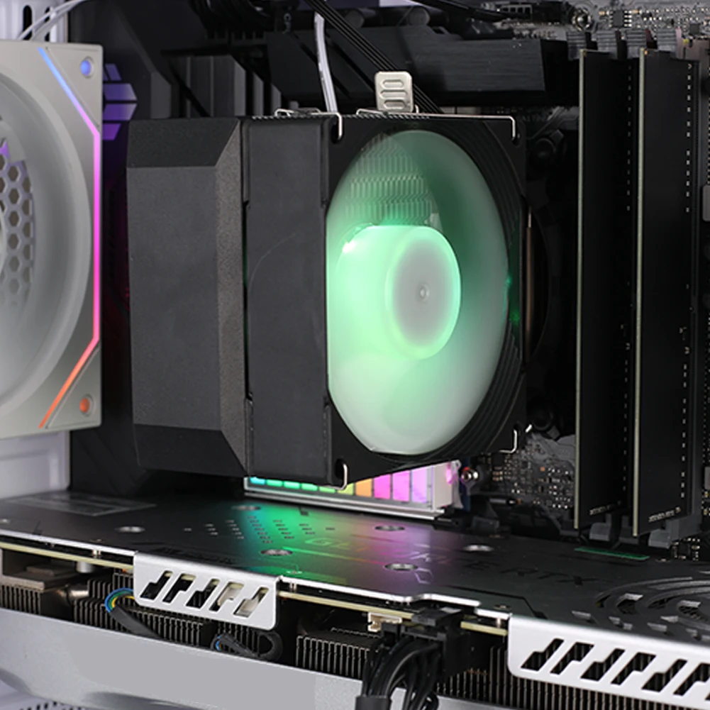 3.Sistema de rodamiento hidráulico:Diseñado con un rodamiento hidráulico, este ventilador de refrigeración de CPU garantiza un rendimiento más silencioso y estable, prolongando la vida útil del ventilador y manteniendo una eficiencia de refrigeración óptima.