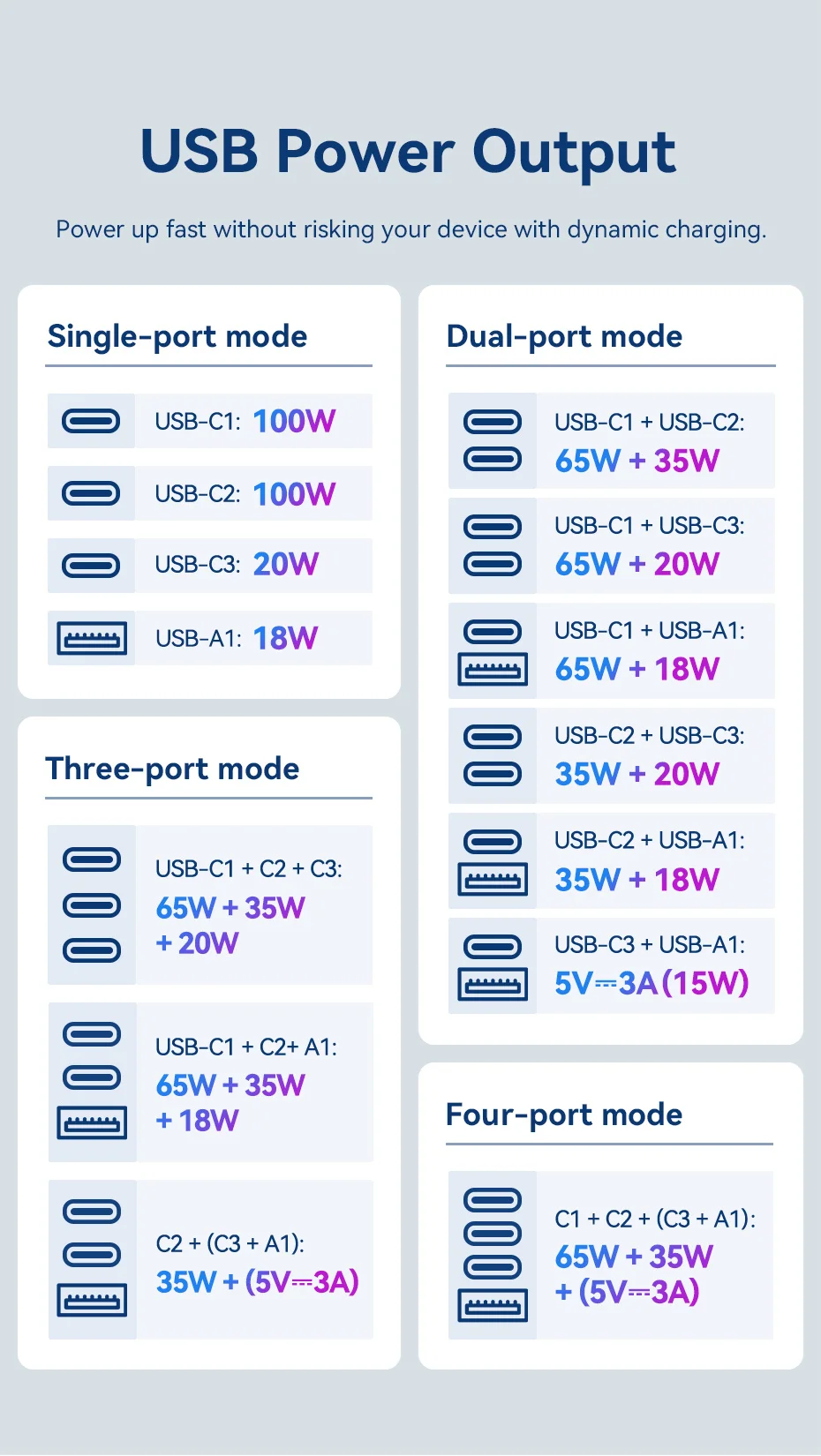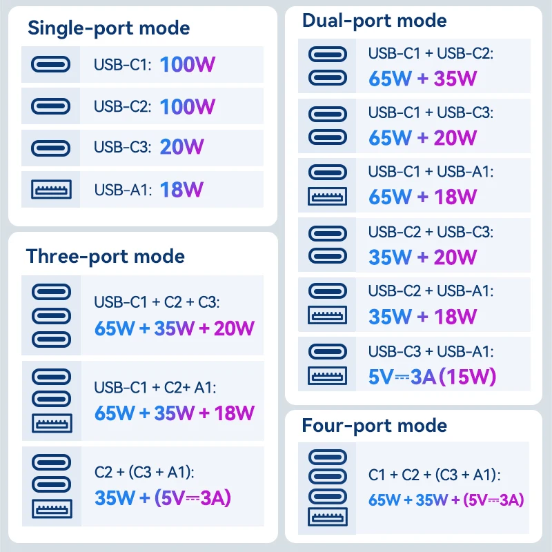 USB-C1 + C2 + A1: 65,0 W + 35,0 W + 18,0 W