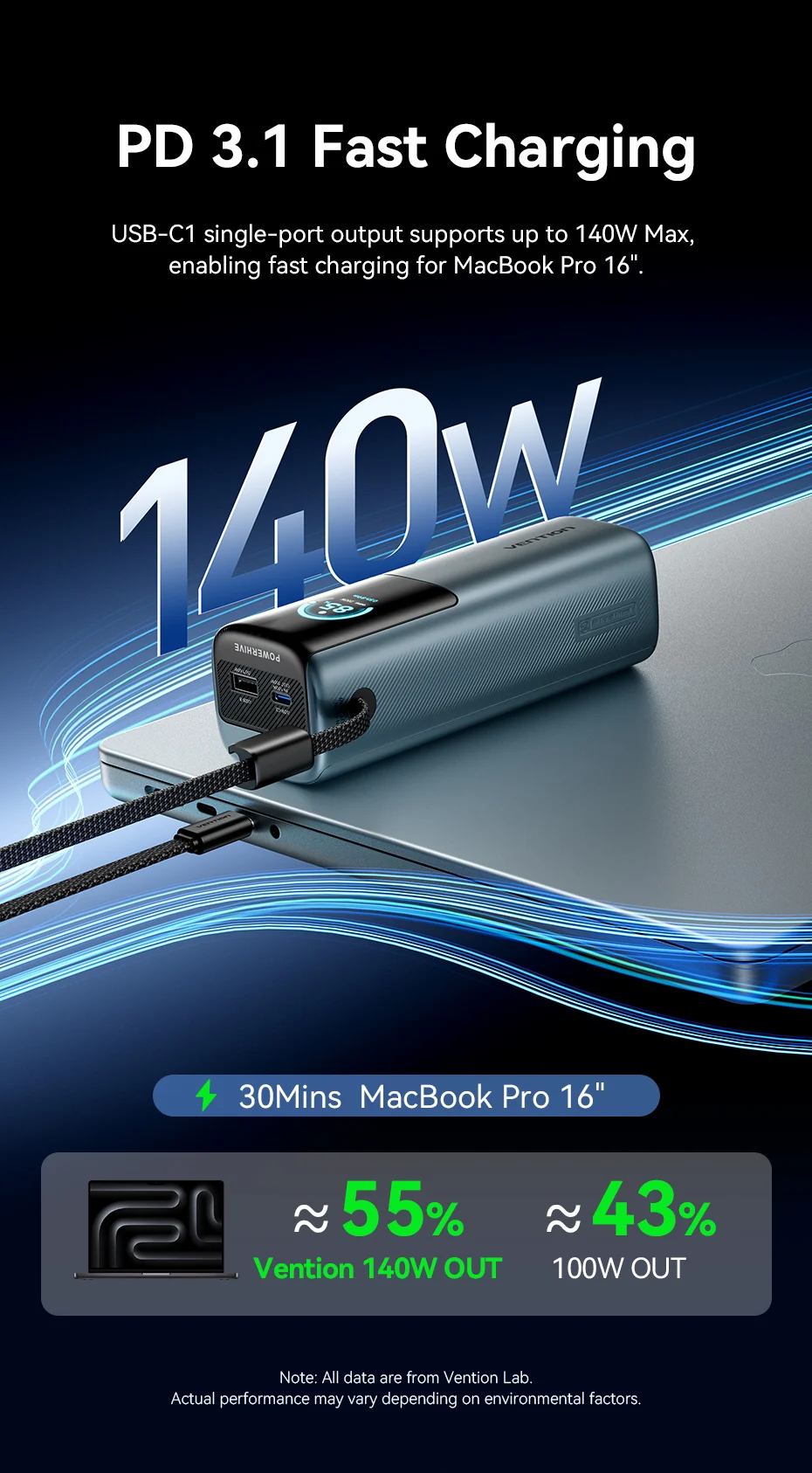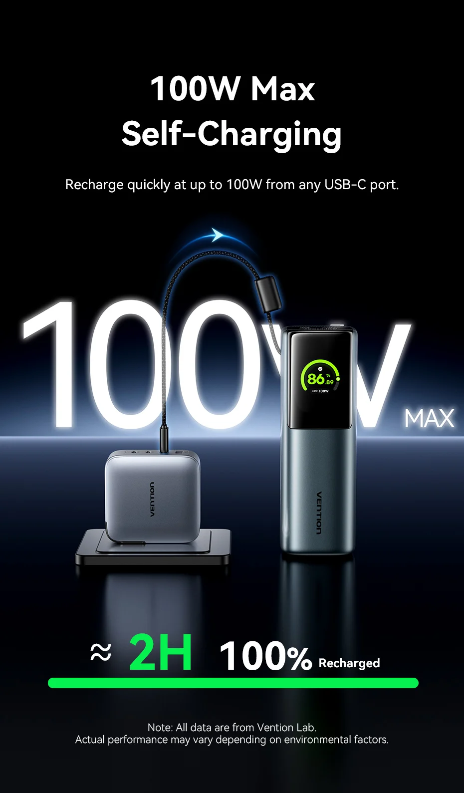 Gracias a la tienda, al vendedor y a la empresa Vention por un producto bueno y de alta calidad. Llegó en tres semanas, todo bien embalado, la caja intacta, e incluyeron un estuche extra para el power bank tal como prometieron. El cable de 100 vatios también es de alta calidad, ya que el power bank es de hierro y pesado; el cable en la caja pesa un poco. Caja con sellos, todo nuevo. El producto se ve bonito y de alta calidad. Probaré con un portátil. Llegó cargado al 93%, la pantalla es informativa.