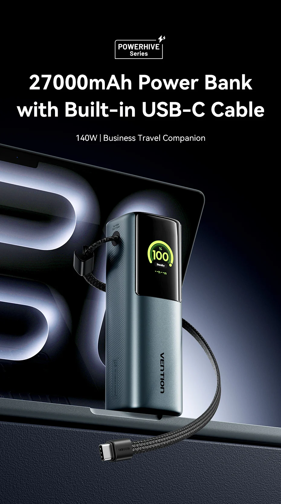Gracias a la tienda, al vendedor y a la empresa Vention por un producto bueno y de alta calidad. Llegó en tres semanas, todo bien embalado, la caja intacta, e incluyeron un estuche extra para el power bank tal como prometieron. El cable de 100 vatios también es de alta calidad, ya que el power bank es de hierro y pesado; el cable en la caja pesa un poco. Caja con sellos, todo nuevo. El producto se ve bonito y de alta calidad. Probaré con un portátil. Llegó cargado al 93%, la pantalla es informativa.