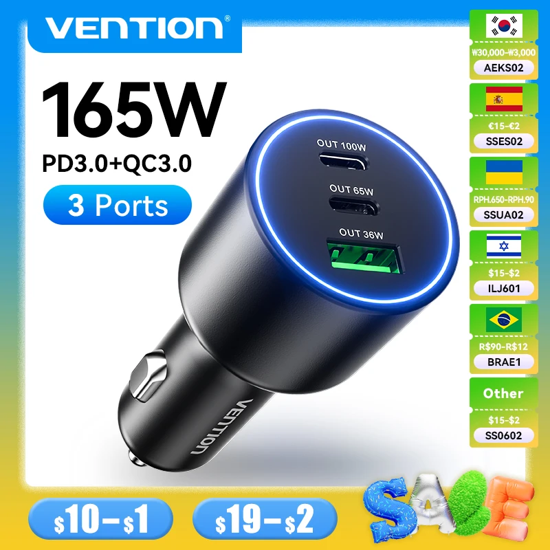 Comprar Vention 165W cargador de coche QC3.0 carga rápida PPS PD3.0 FCP AFC USB tipo C carga de teléfono de coche para iPhone 16 15 14 portátiles Samsung