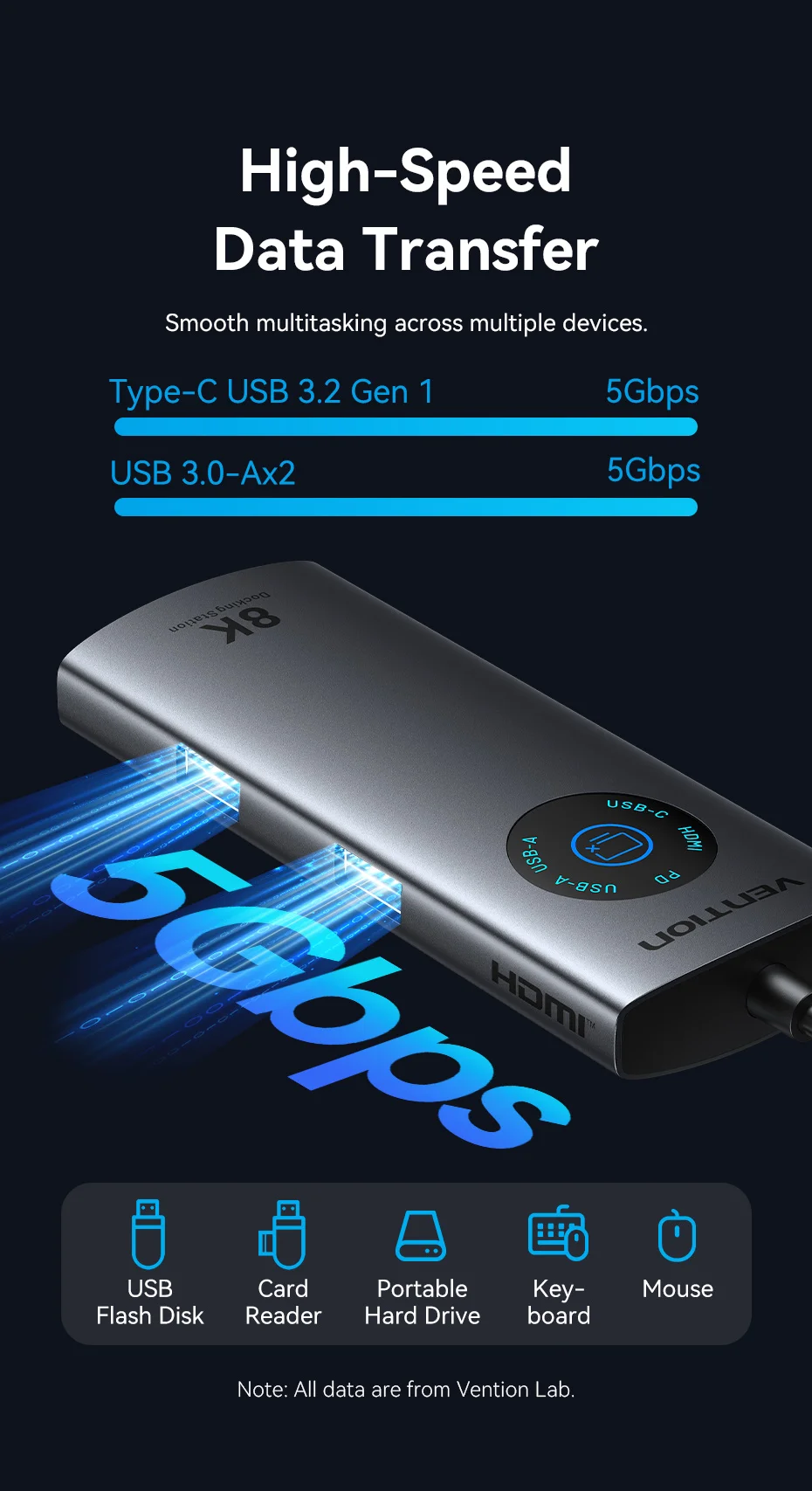 *Equipado con múltiples interfaces como USB-C y USB-A, la velocidad de transferencia de datos puede alcanzar hasta 5 Gbps.