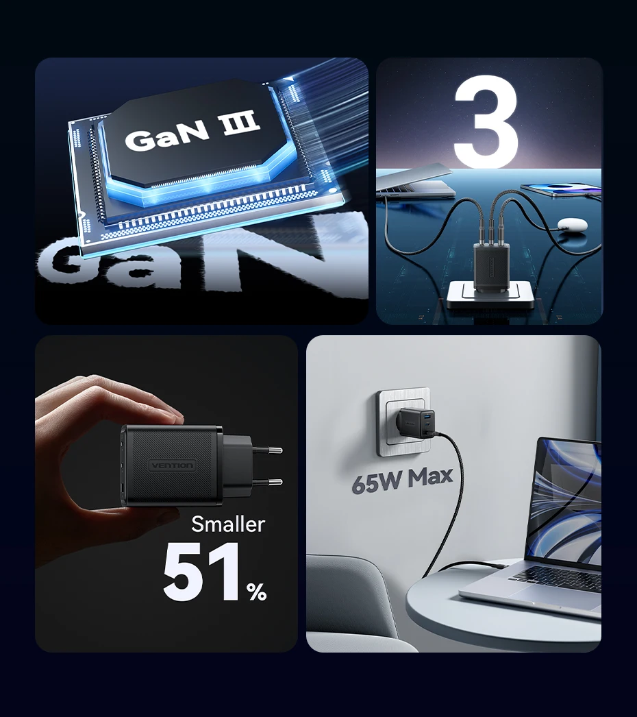 Comprar Vention 65W GaN cargador tipo C carga rápida 4,0 3,0 cargador USB para iPhone 15 14 13 12 Pro Max cargador rápido para ordenador portátil carga PD