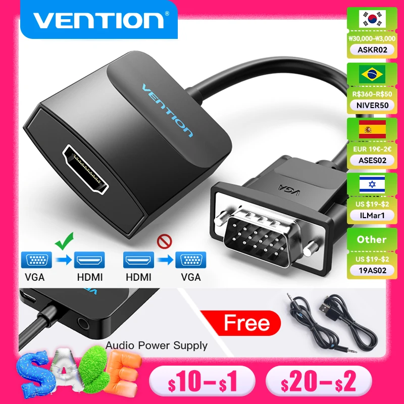 Comprar Vention-Adaptador de VGA a HDMI, Cable convertidor de 1080P VGA macho a HDMI hembra con Audio, PS4 alimentación USB para/3 HDTV VGA HDMI