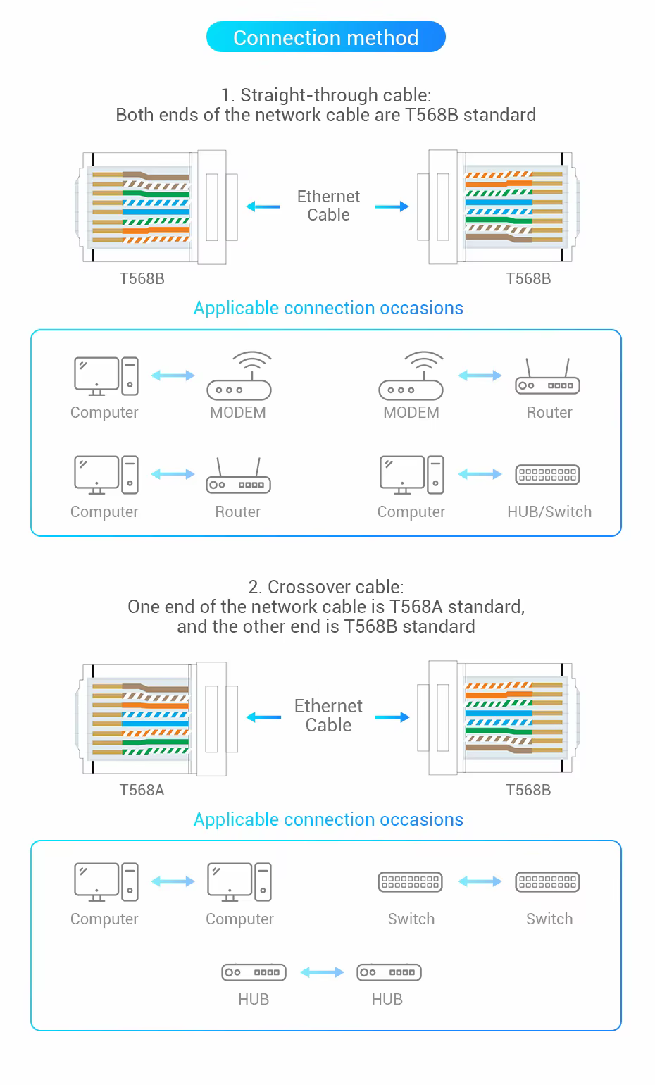 2:Crossover cable; one end of the network cable is T568A standard,and the other is T568B standard