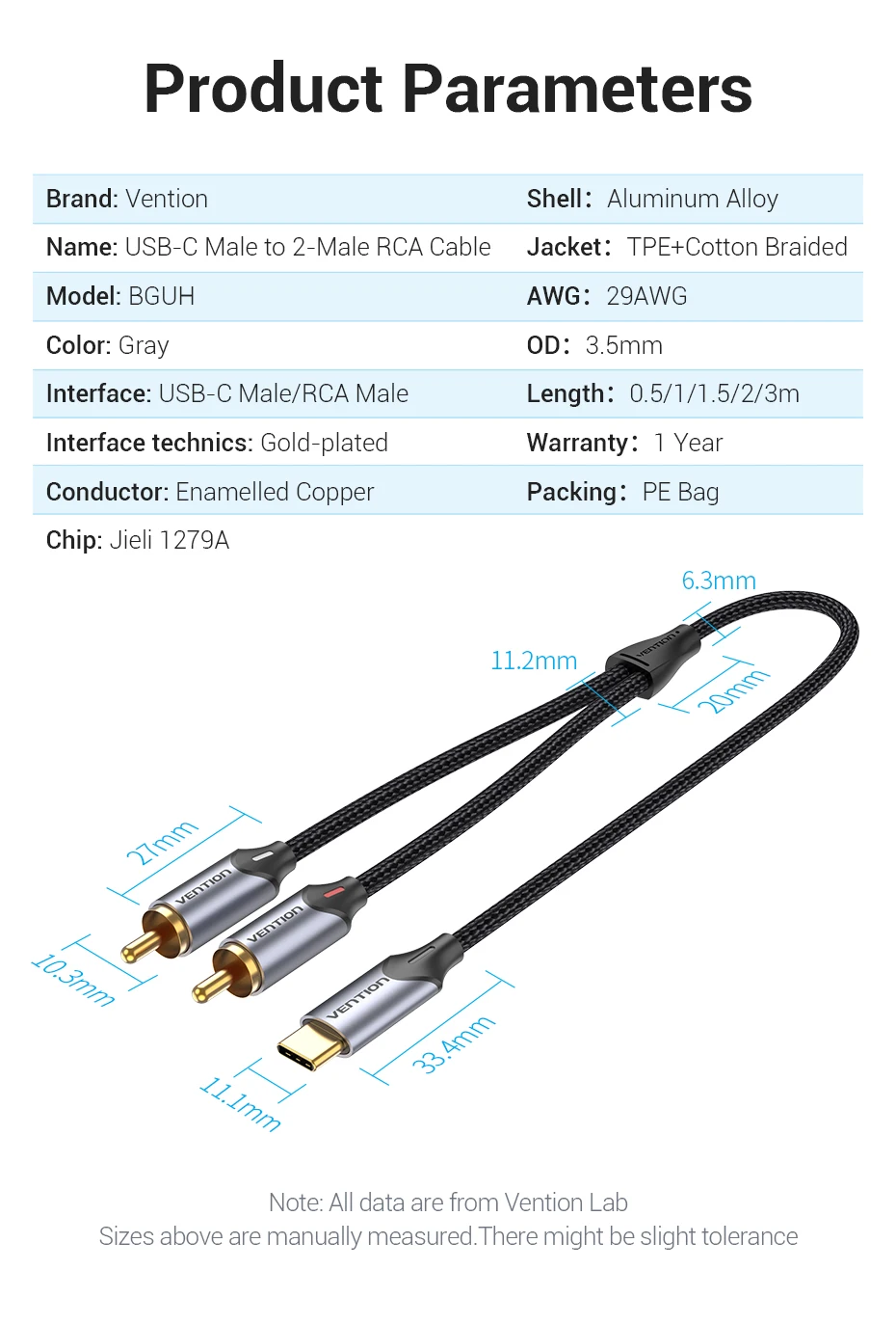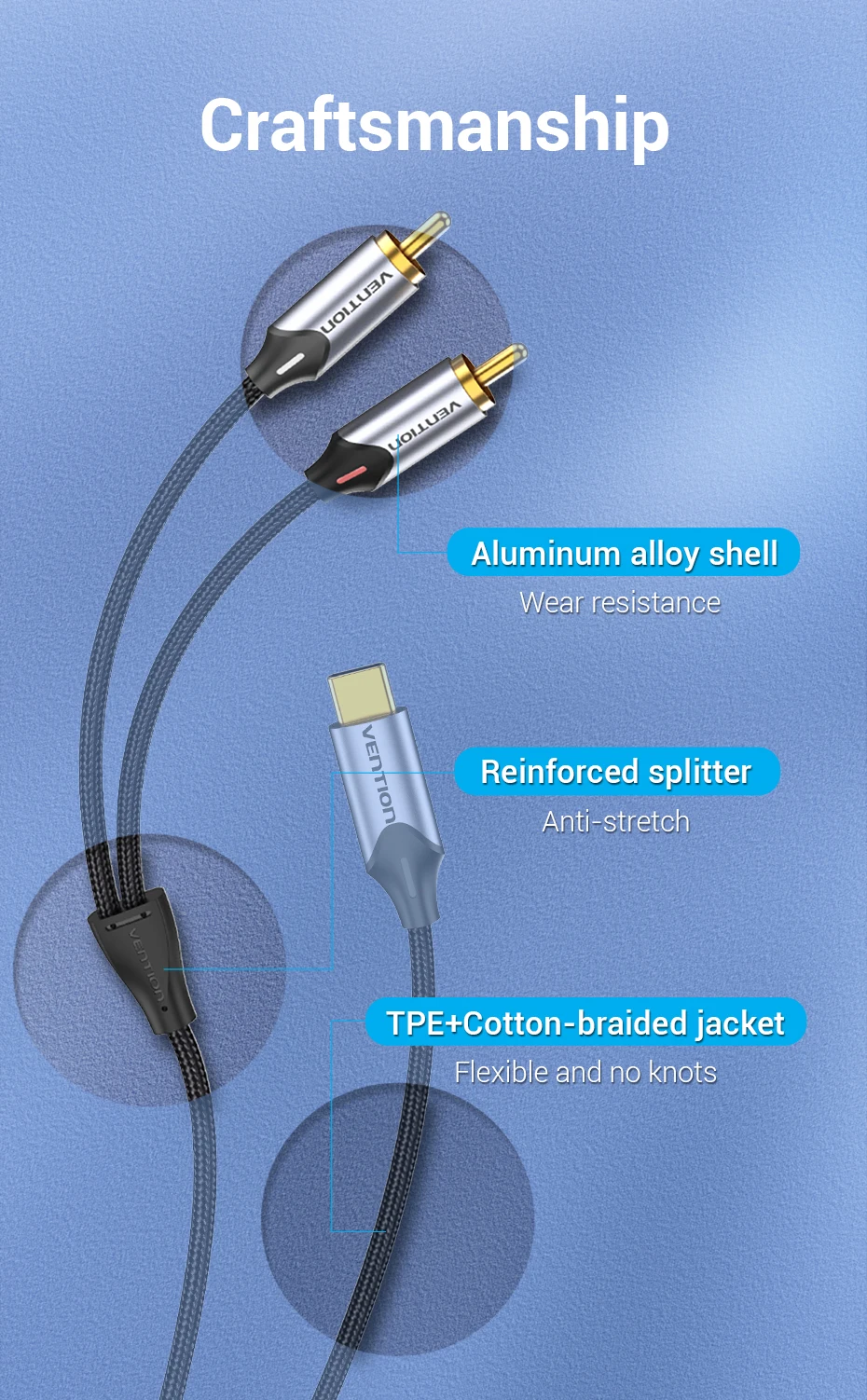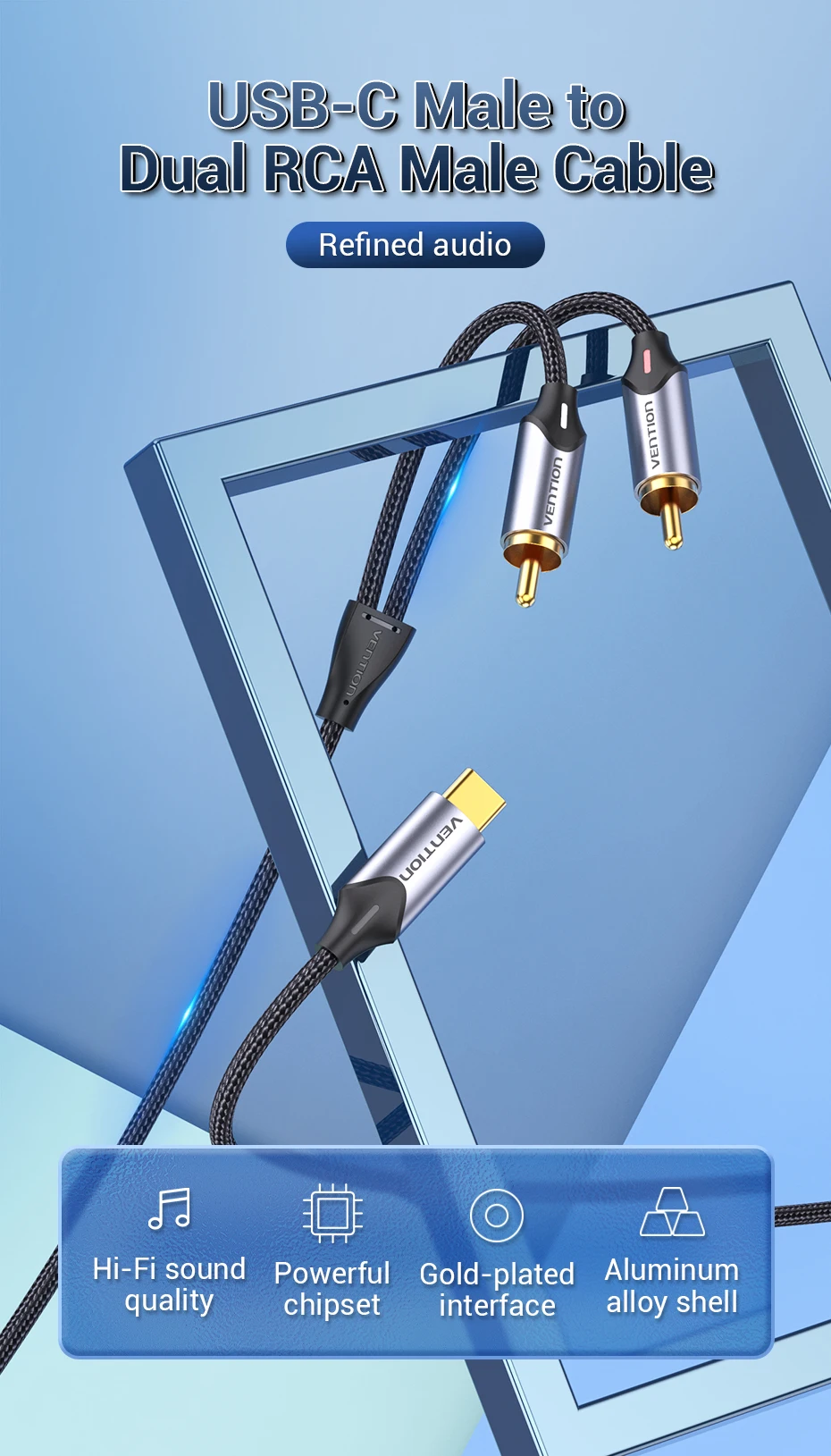 Comprar Vention-Cable de Audio USB tipo C a 2 RCA para amplificador de altavoz, divisor para portátil Huawei, Xiaomi, 1m, 2m, 3m