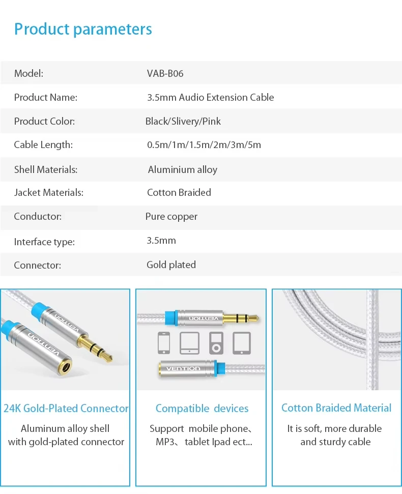 Vention Cable auxiliar Cable de extensión de auriculares Jack de 3,5mm macho a hembra para Cable de Audio de computadora Cable extensor de auriculares de 3,5mm 3m
