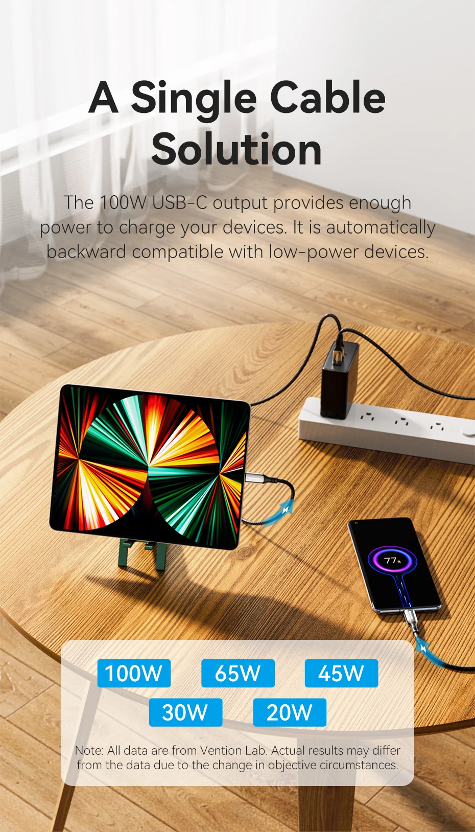 La salida de 100W y La proporciona suficiente energía para cargar sus dispositivos. Es automáticamente retrocompatible con dispositivos de baja potencia.