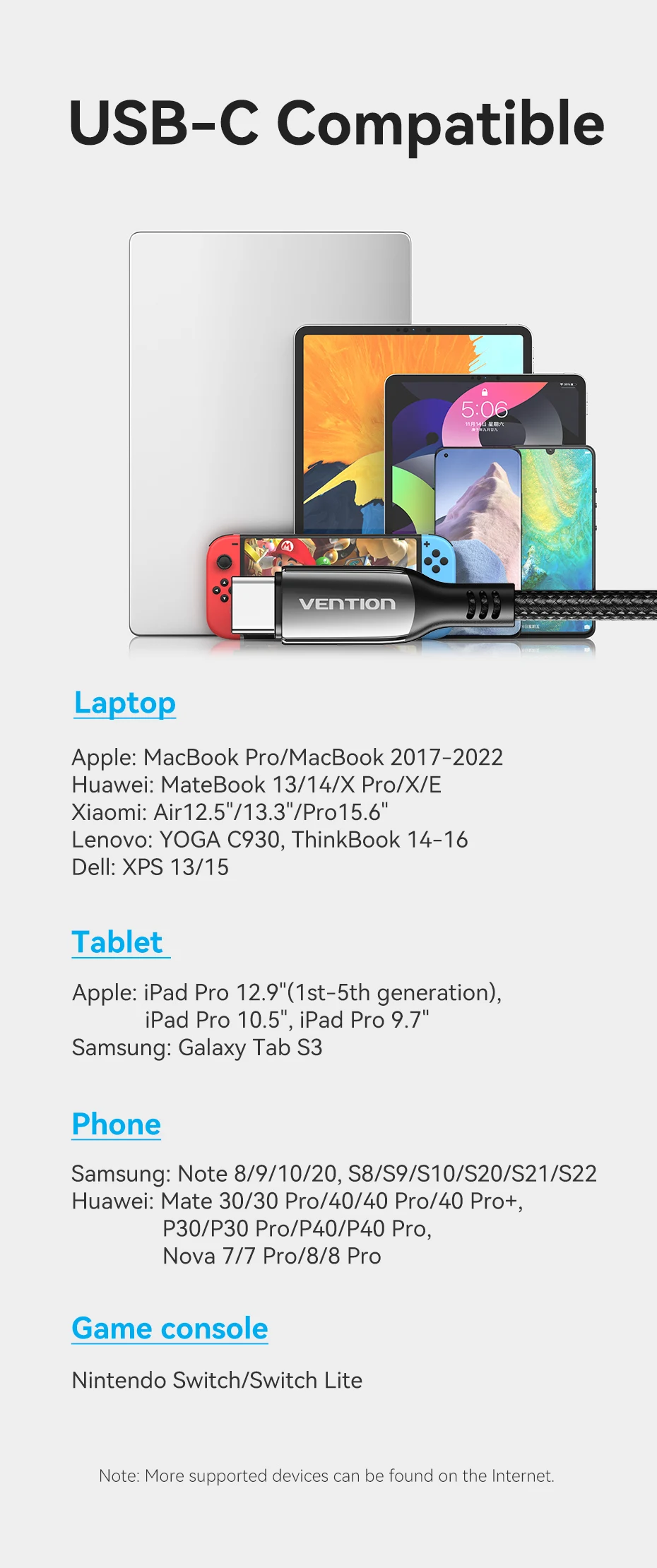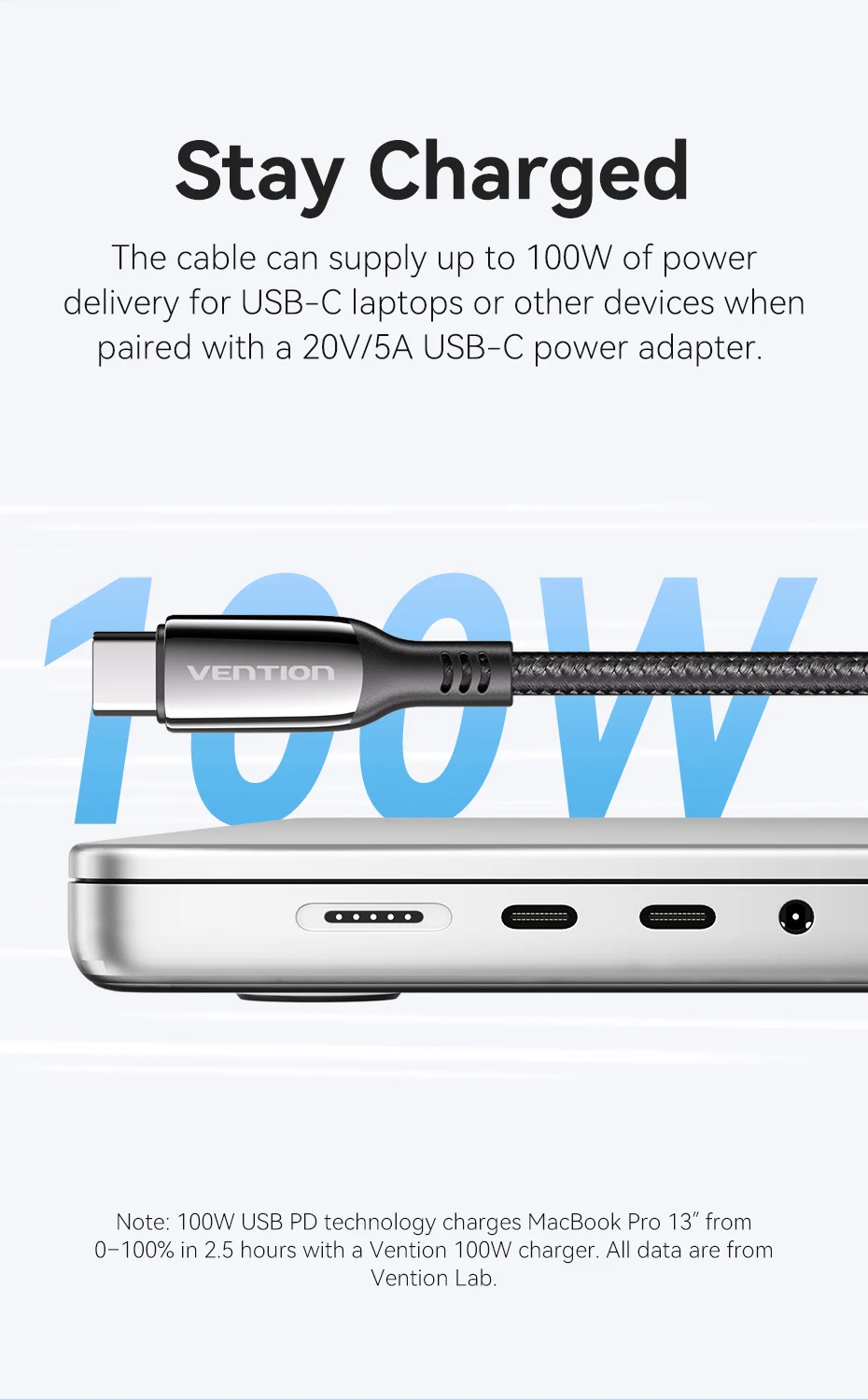 El cable puede suministrar hasta 100W de suministro de energía para ordenadores portátiles u otros dispositivos cuando se combina con un adaptador de corriente de 20V/5A DE LA USB-C.