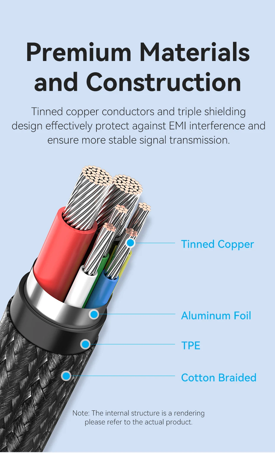 Los conductores de cobre estañado y el diseño de triple blindaje protegen eficazmente contra las interferencias EMI y garantizan una transmisión de señal más estable.