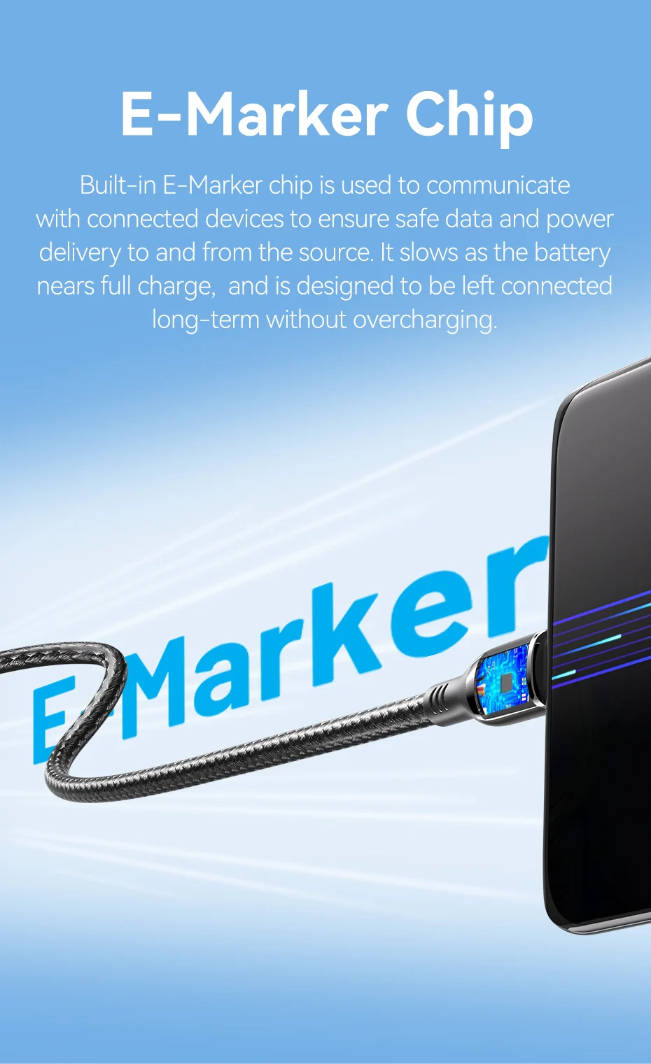El chip E-Marker incorporado se utiliza para comunicarse con los dispositivos conectados para garantizar la seguridad de los datos y el suministro de energía desde y hacia la fuente. Se ralentiza a medida que la batería se acerca a la carga completa y está diseñado para estar conectado a largo plazo sin sobrecargar.