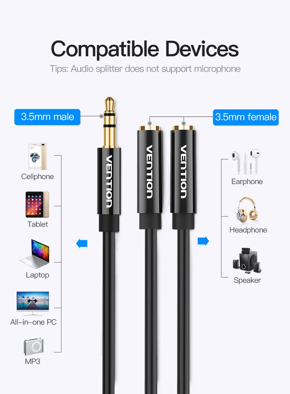 Vention-Cable divisor de Audio de 3,5mm, conector macho a 2 hembra de 3,5mm, micrófono Y, Cable auxiliar divisor para iPhone, portátil, MP3, divisor de auriculares