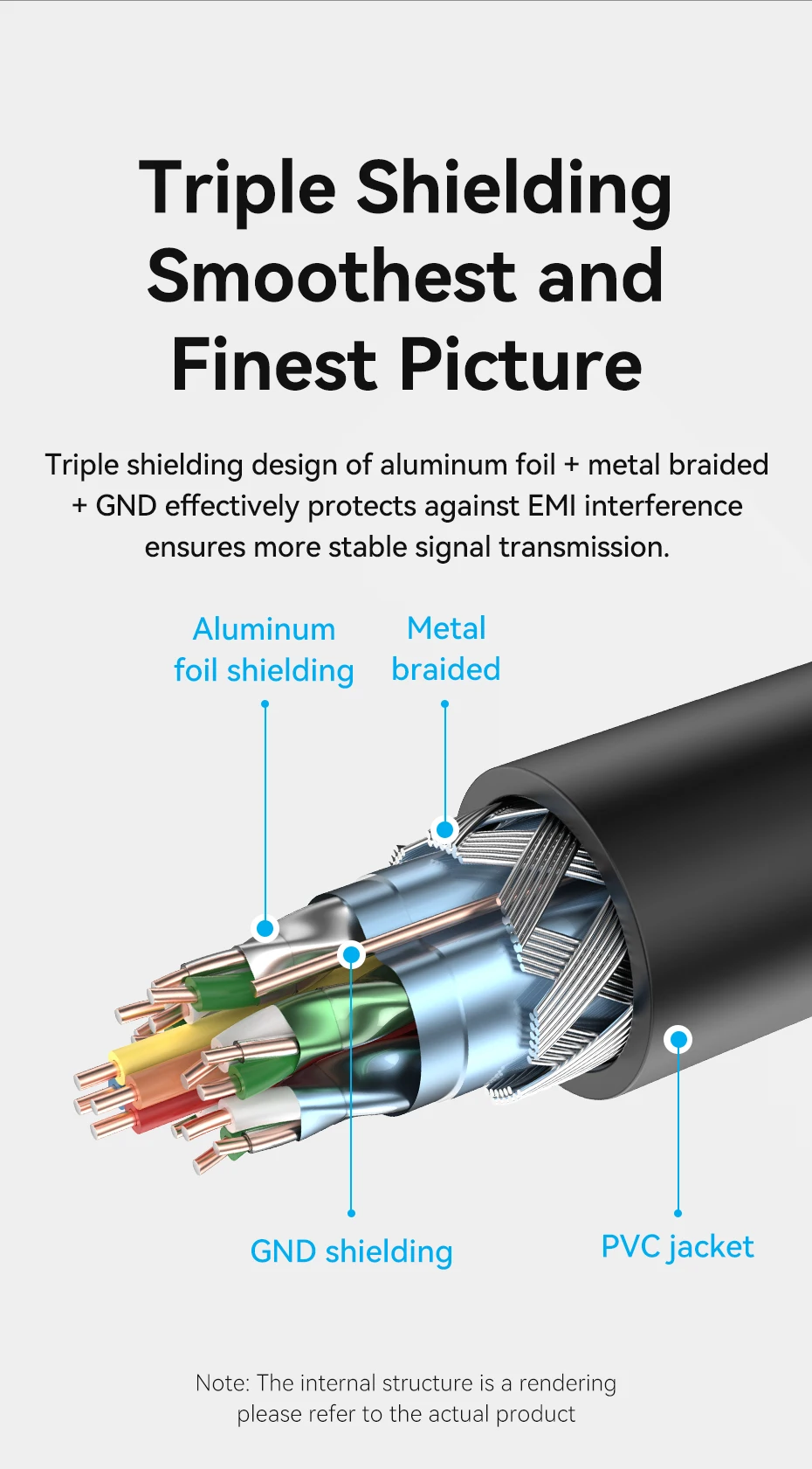 El diseño de triple blindaje de papel de aluminio + metal trenzado + GND protege eficazmente contra interferencias EMI y garantiza una transmisión de señal más estable.