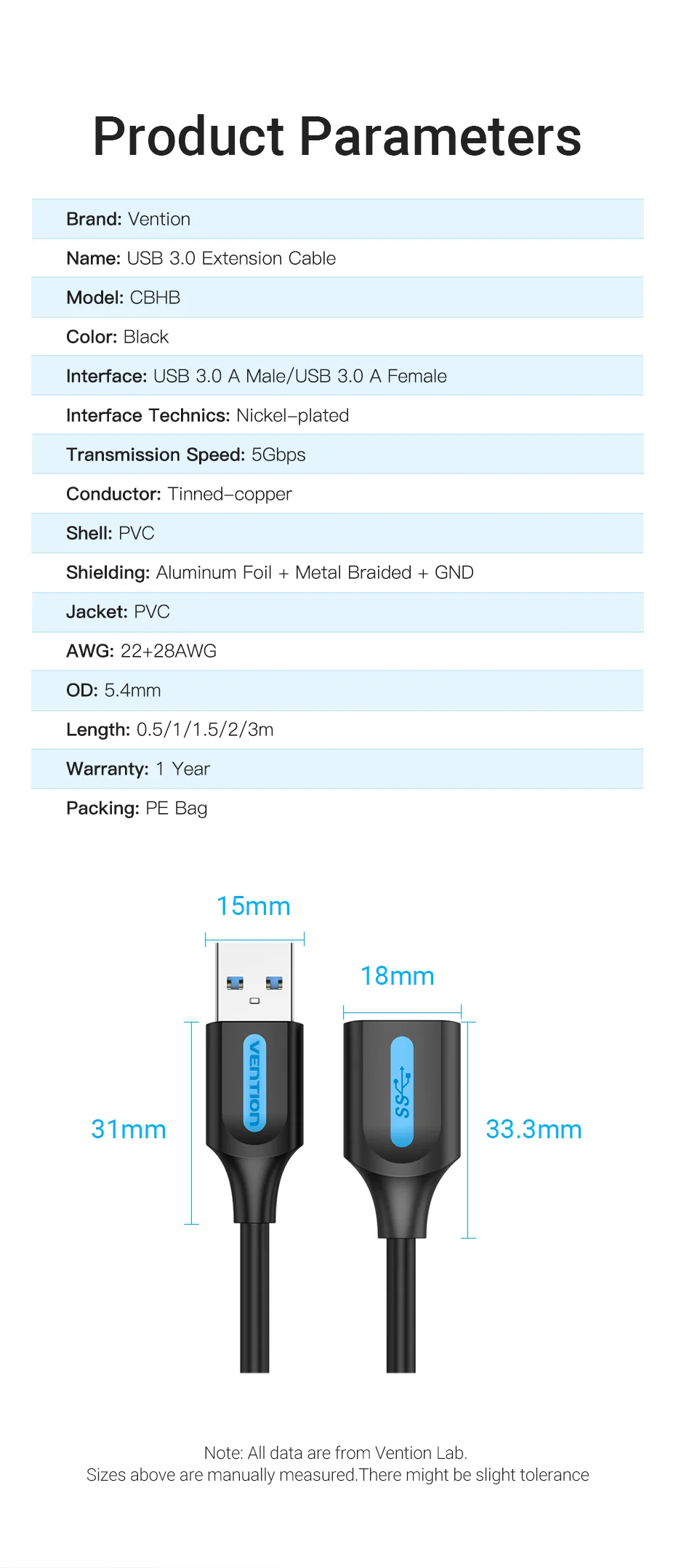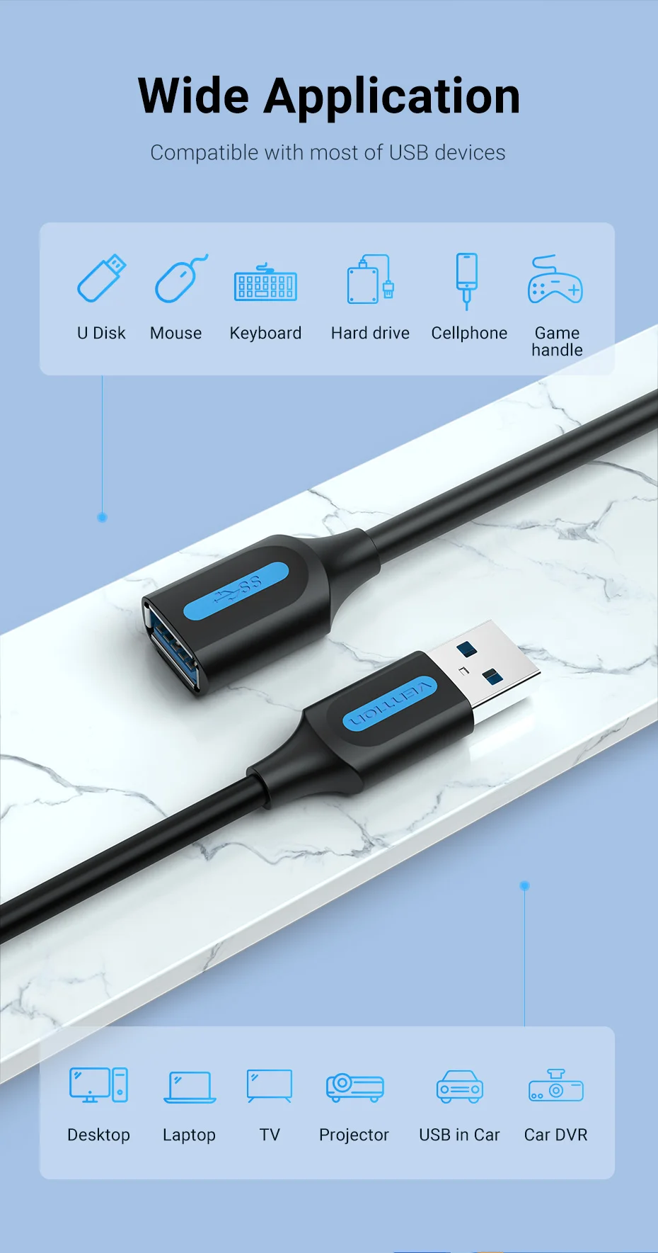 Este cable de extensión USB 3,0 admite una velocidad de hasta 5Gbps ,10 veces más rápida que el cable de extensión USB 2,0 y transfiere archivos de 1GB en 5 segundos. (Nota: Todos los datos son de vention lab) también retrocompatibles con USB 2,0, 1,1 y 1,0 (velocidad limitada por USB bus). Plug & Play en el sistema universal, no requiere controlador.