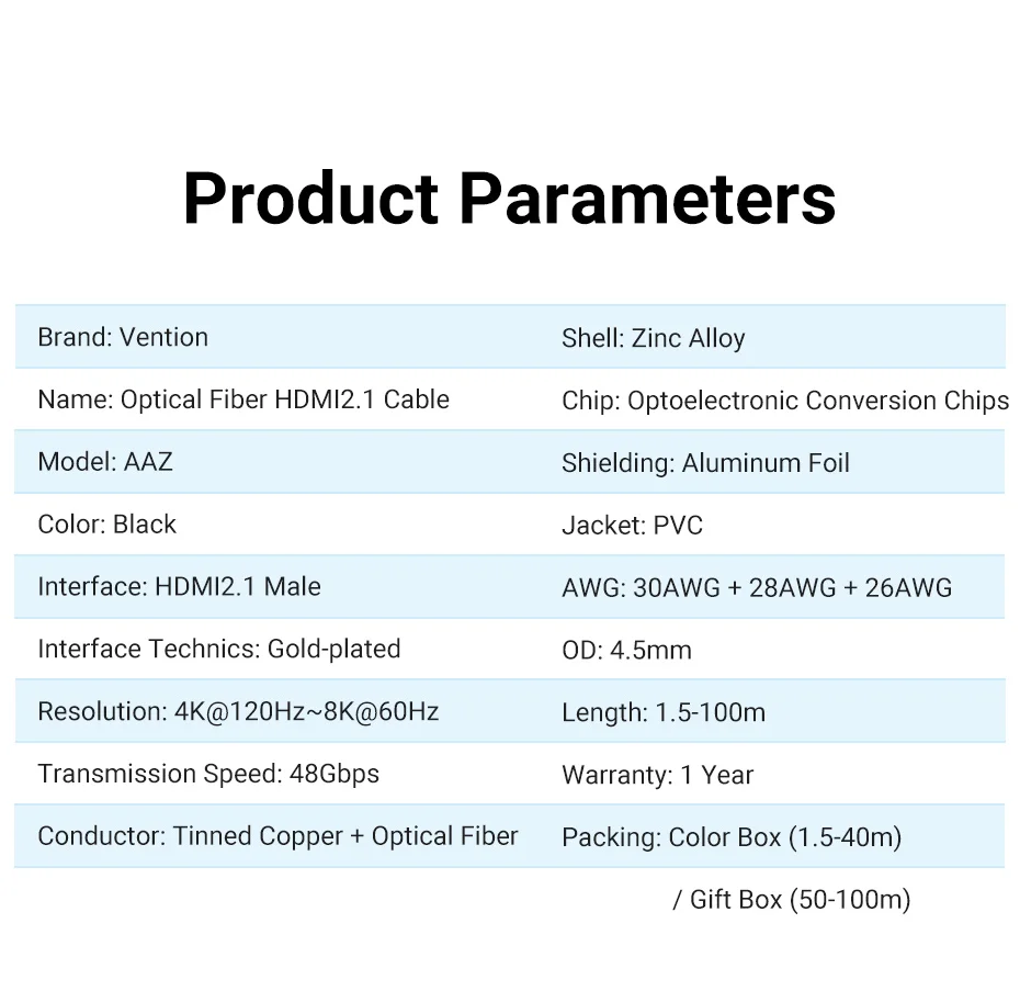 【Resolución Ultra HD】Vention Cable HDMI de fibra óptica 8K Soporte Ultra Resolución de 8K 7680*4320, Soporte 8K @ 60Hz,4K @ 120Hz,UHD ,HDR, proporciona una experiencia de transmisión de vídeo Ultra HD y efectos visuales 3D, transmisión de sincronización de audio y vídeo.