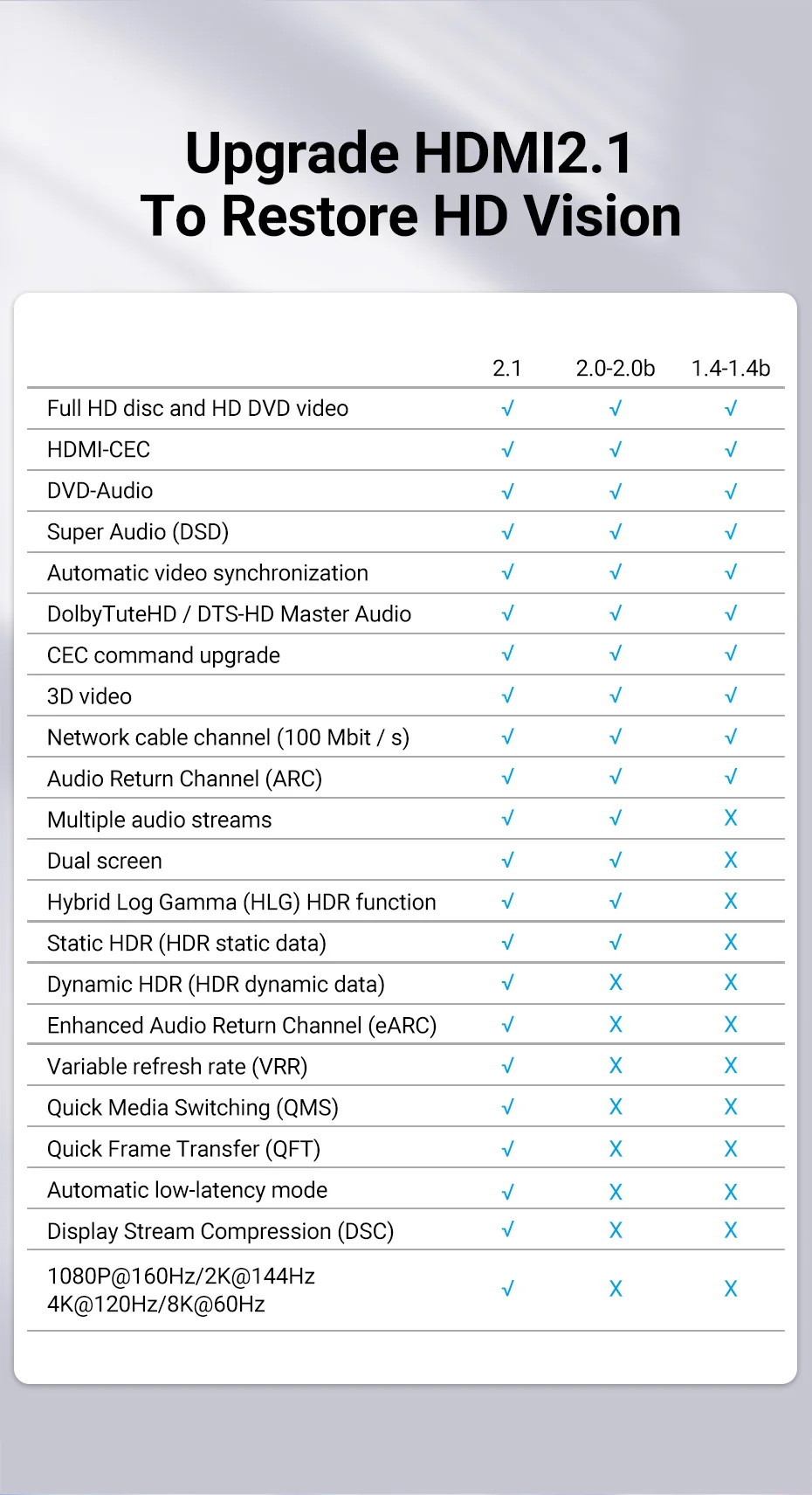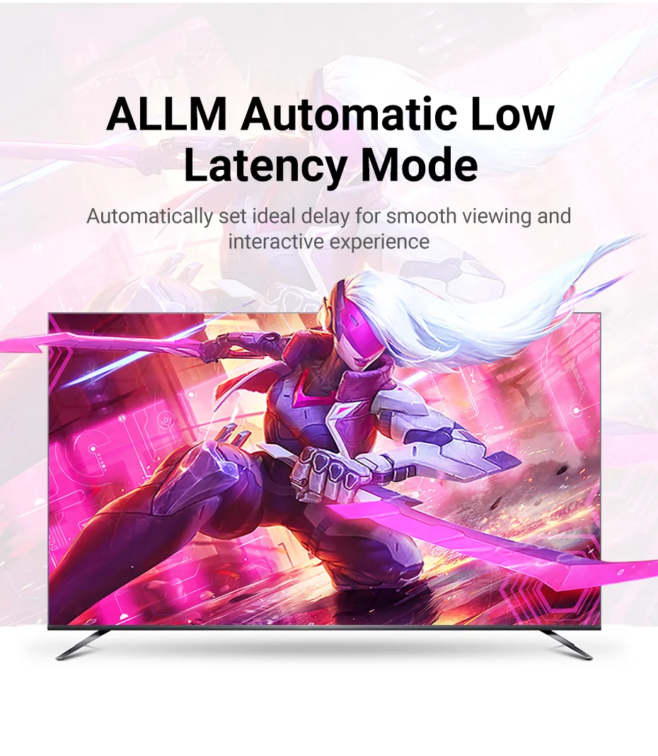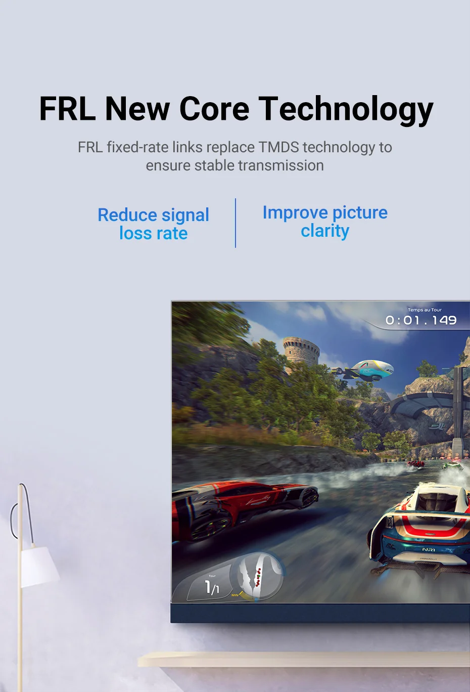 Soporte de longitud completa 4K @ 120Hz,8K @ 60Hz Resolución HD compatible con el modo de juego VRR para reducir el retraso/crack
