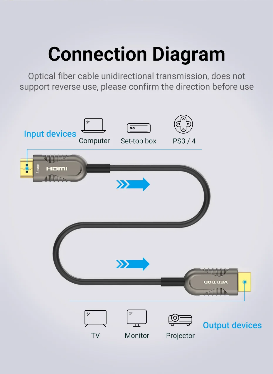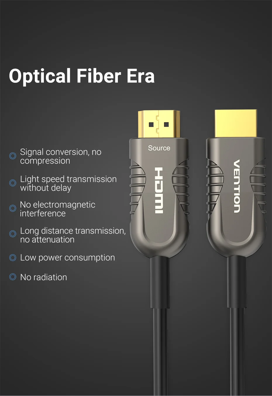 【Resolución Ultra HD】Vention Cable HDMI de fibra óptica 8K Soporte Ultra Resolución de 8K 7680*4320, Soporte 8K @ 60Hz,4K @ 120Hz,UHD ,HDR, proporciona una experiencia de transmisión de vídeo Ultra HD y efectos visuales 3D, transmisión de sincronización de audio y vídeo.
