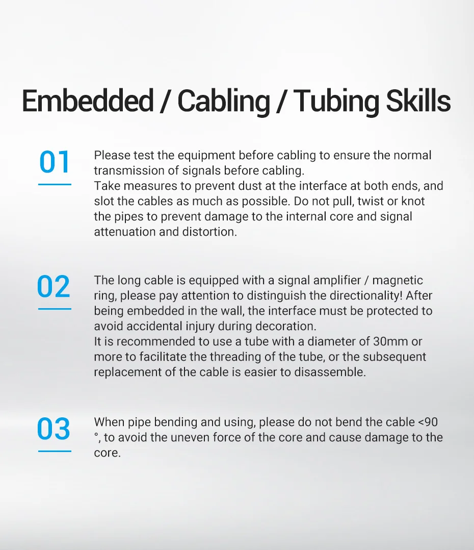 2. The long cable is equipped with a signal amplifier / magnetic ring, please pay attention to distinguish the directionality! After being embedded in the wall, the interface must be protected to avoid accidental injury during decoration.