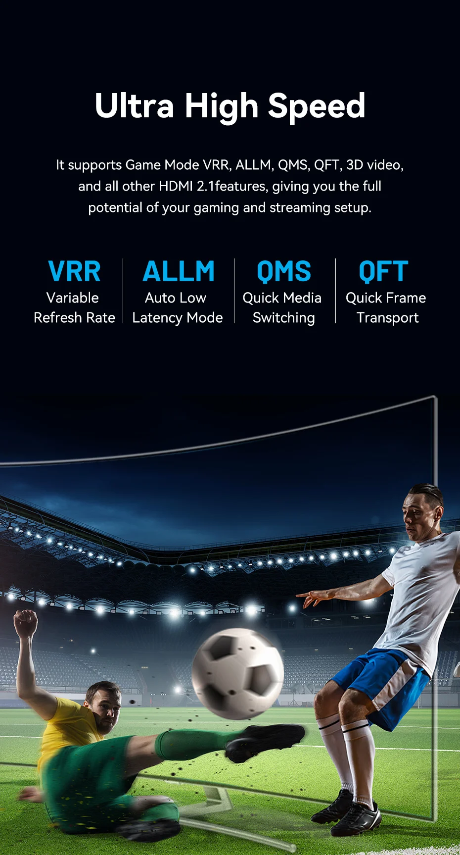 Es compatible con el modo de juego VRR, ALLM, QMS, QFT, video 3D y todas las demás funciones HDMI 2.1, lo que le brinda todo el potencial de su configuración de juegos y transmisión.