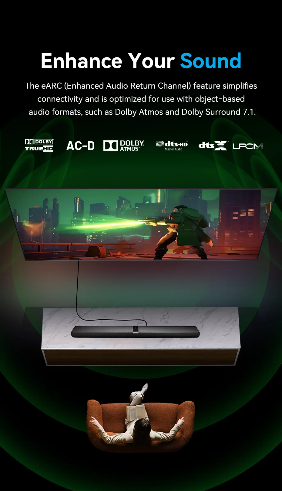 La función eARC (canal de retorno de audio mejorado) simplifica la conectividad y está optimizada para su uso con formatos de audio basados en objetos, como Dolby Atmos y Dolby Surround 7.1.