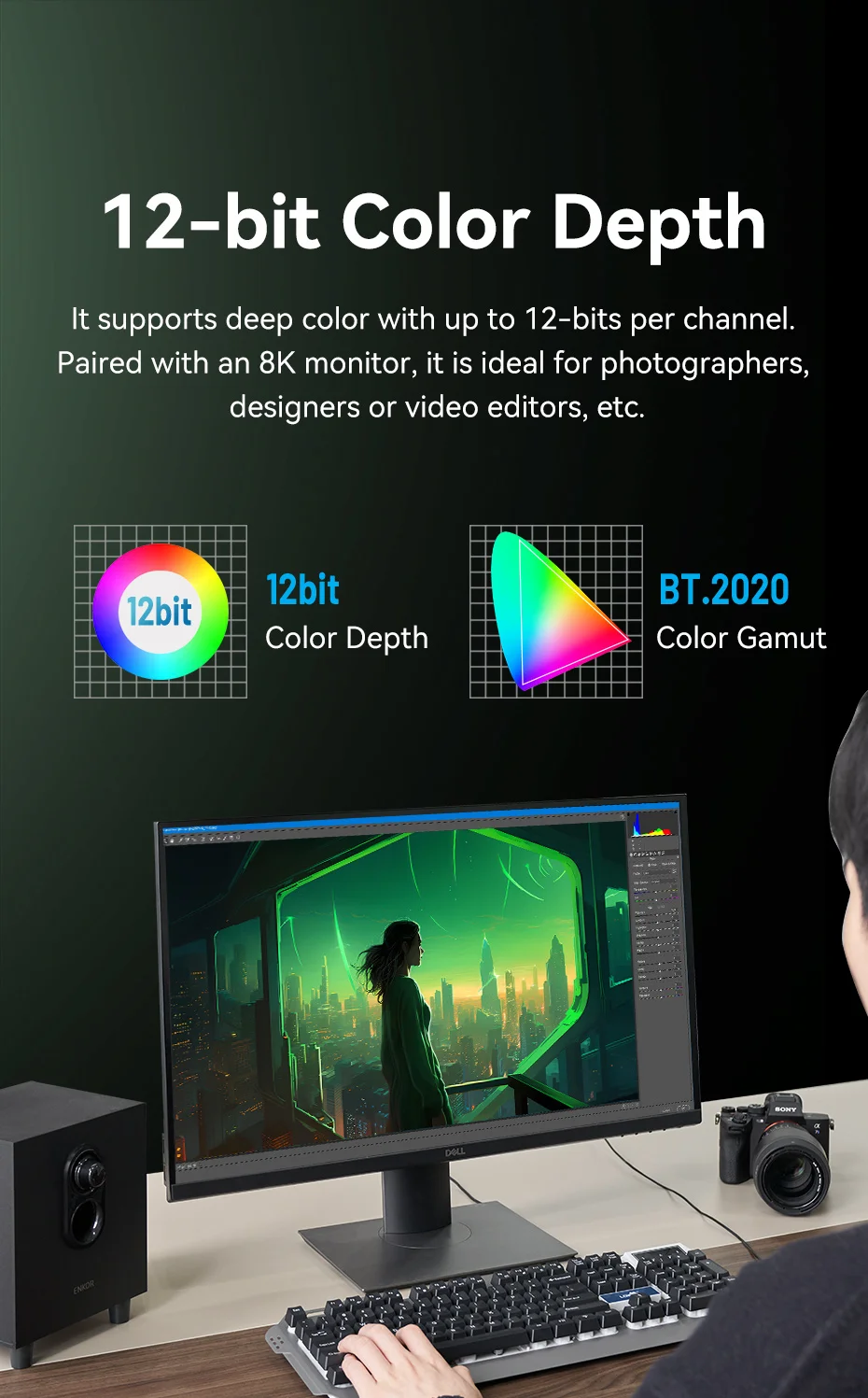 Admite colores profundos con hasta 12 bits por canal.Combinado con un monitor 8K, es ideal para fotógrafos, diseñadores o editores de vídeo, etc.