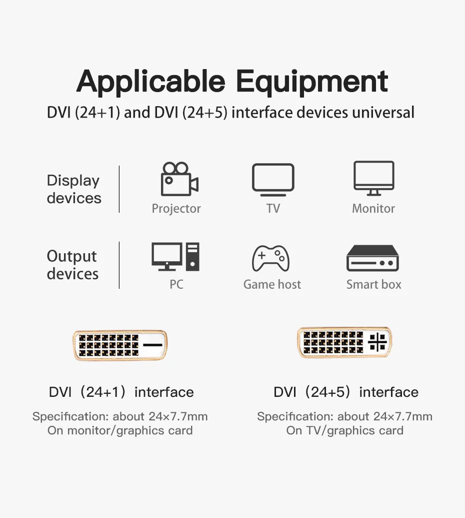 Suitable for standard HDMI interface, DVI (24+1) and DVI (24+5) interface devices universal.