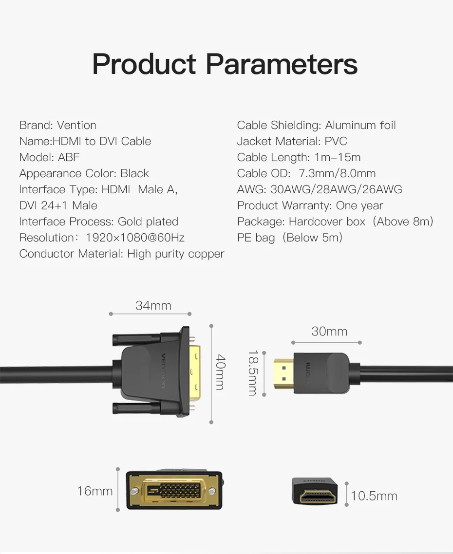 ①DVI to HDMI 0.5m/ 1m/ 1.5m/ 2m/ 3m supports up to 4K60Hz. 5m/ 8m supports up to 4K30Hz.