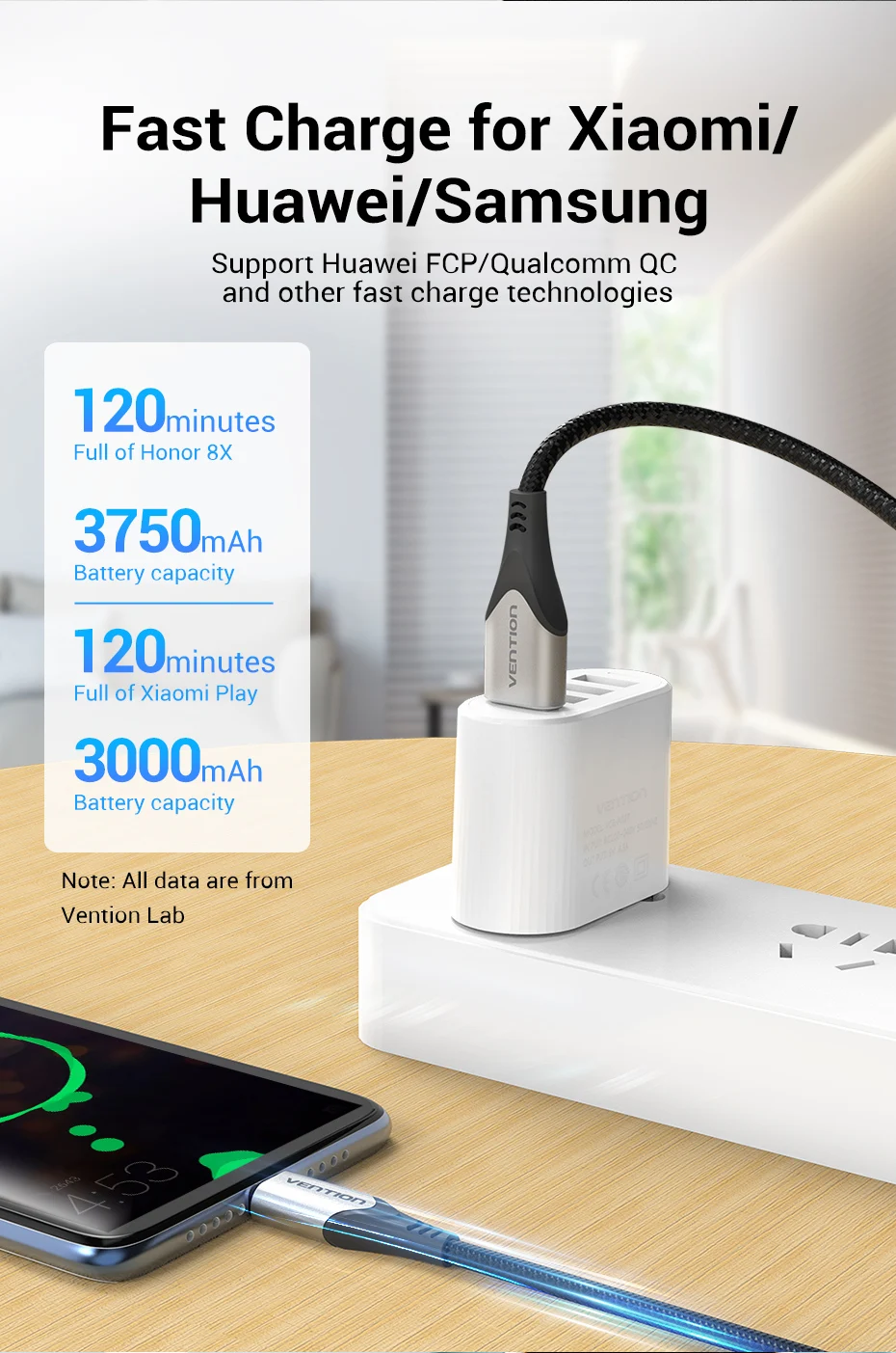 Comprar Vention-Cable micro USB recubierto en nailon para carga rápida, cables de datos de teléfono móvil, USB de tipo C de 3A para Samsung, Xiaomi, LG y Android