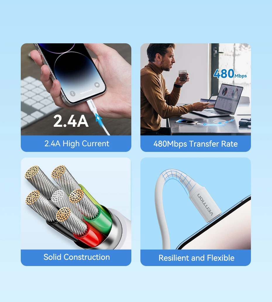 2,4A de alta corrienteVelocidad de transferencia de 480 MbpsConstrucción sólidaResiliente y flexible