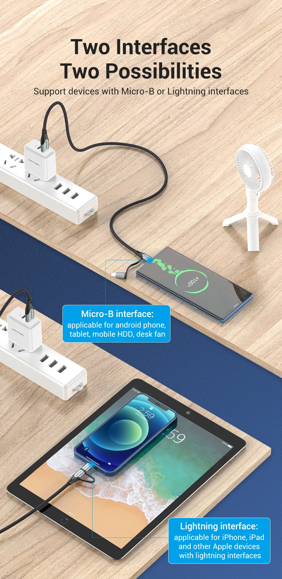 Compatible con dispositivos con interfaces micro-b o Lightning