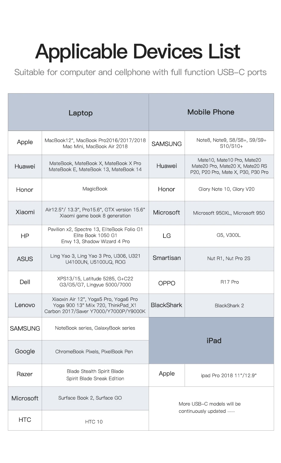 -Compatible con 2018/2017/2016 MacBook Pro, iPad Pro 2018 / Mac Mini 2018, iMac 2017, MacBook 2017/2016/2015, Surface Book 2, Pixelbook,HuaWei Mate10, Mate10 Pro,Mate20, mate20 Pro,Mate20 X, Mate20 RS, P20, P20 Pro, Mate X, P30, P30 Pro,Galaxy Book,Galaxy Note8, Note9, S8/S8 +, S9/S9 +, s10/S10 +, Dell XPS 15 / XPS 13, ChromeBook Pixels, PixelBook Pen y otros (consulte la sección detallada de la descripción del producto a continuación)