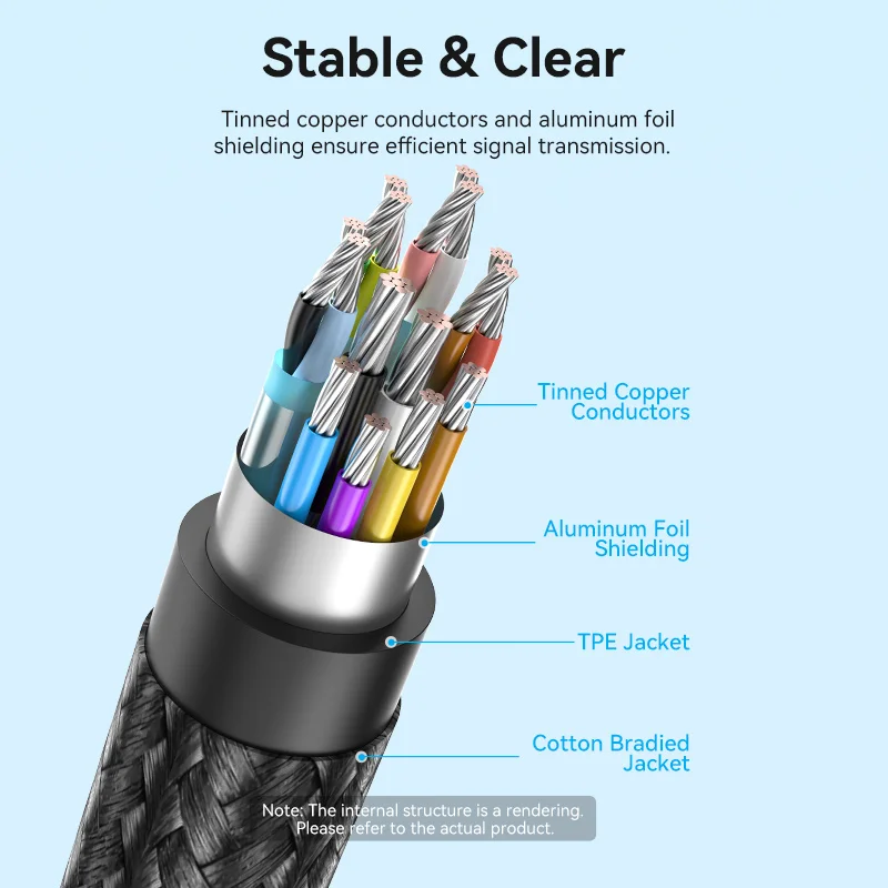 Los conductores de cobre estañado y el blindaje de papel de aluminio garantizan una transmisión de señal eficiente.