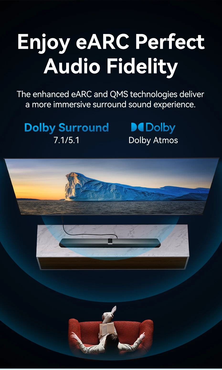 Las tecnologías eARC y QMS mejoradas ofrecen una experiencia de sonido envolvente más inmersiva.