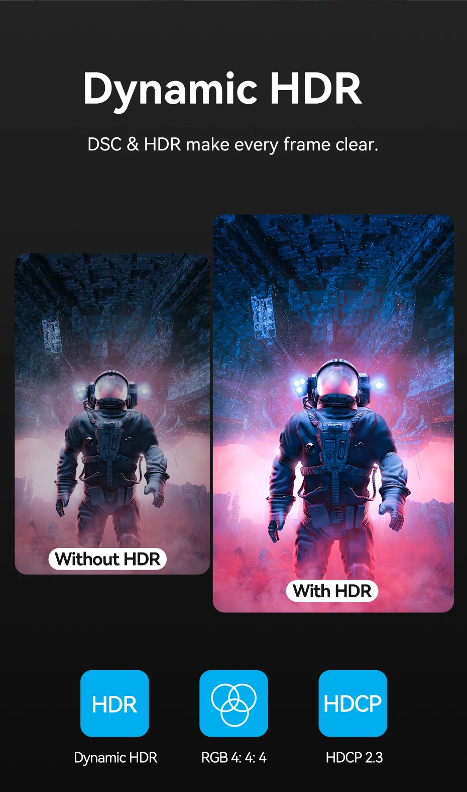 Frecuencia de actualización de 8K a 60Hz, 4K a 240Hz/144Hz para una experiencia de juego inmersiva.