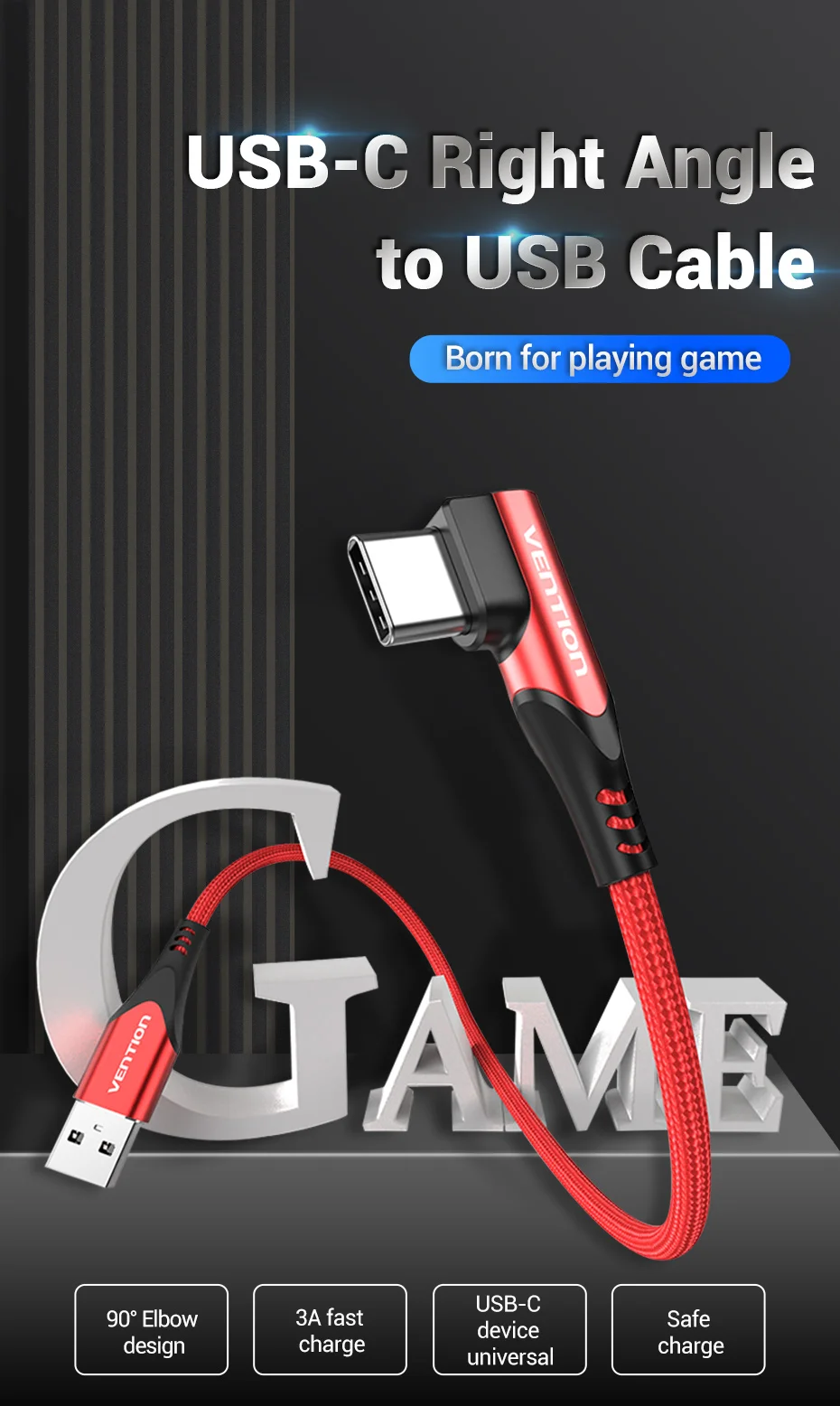 Comprar Vention-Cable USB tipo C de carga rápida, cargador de 3A, 90 grados, para Samsung S10, Xiaomi mi9 10 pro, teléfono