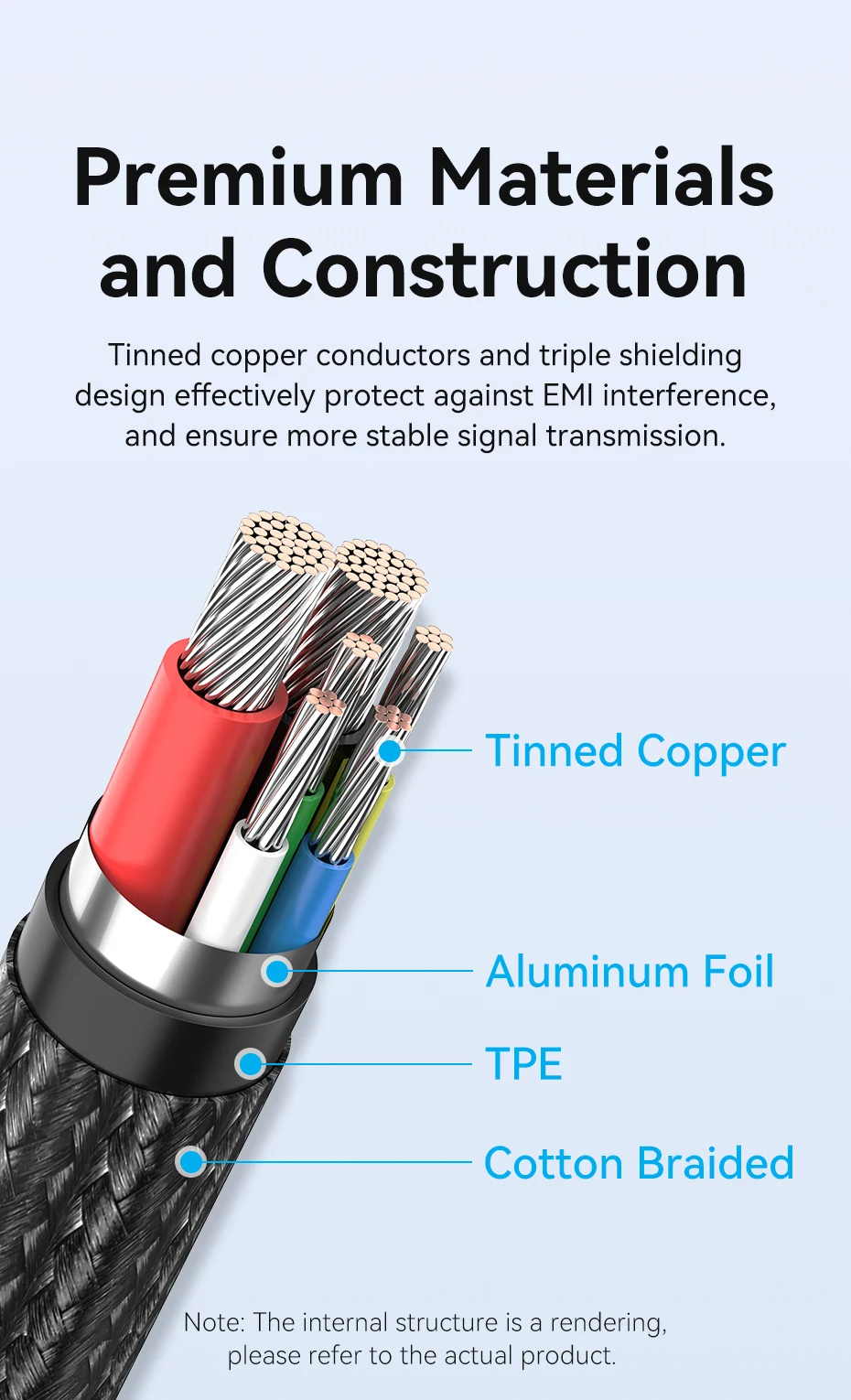Conductores de cobre estañado y diseño de triple blindaje protegen eficazmente contra interferencias EMI y garantizan una transmisión de señal más estable.