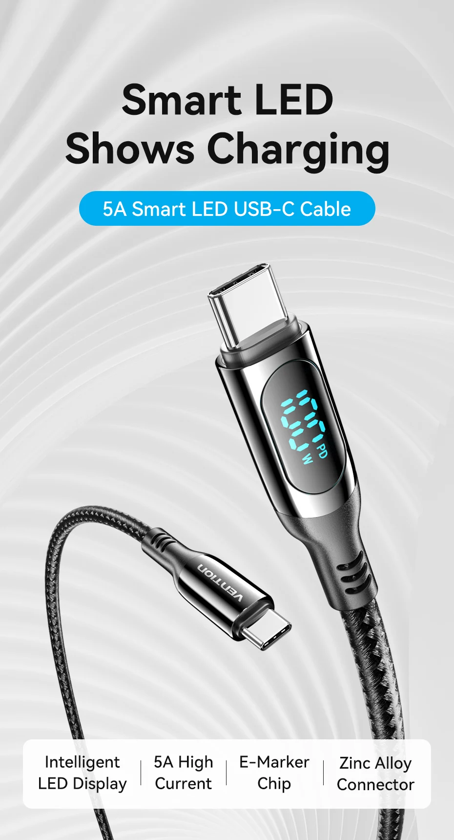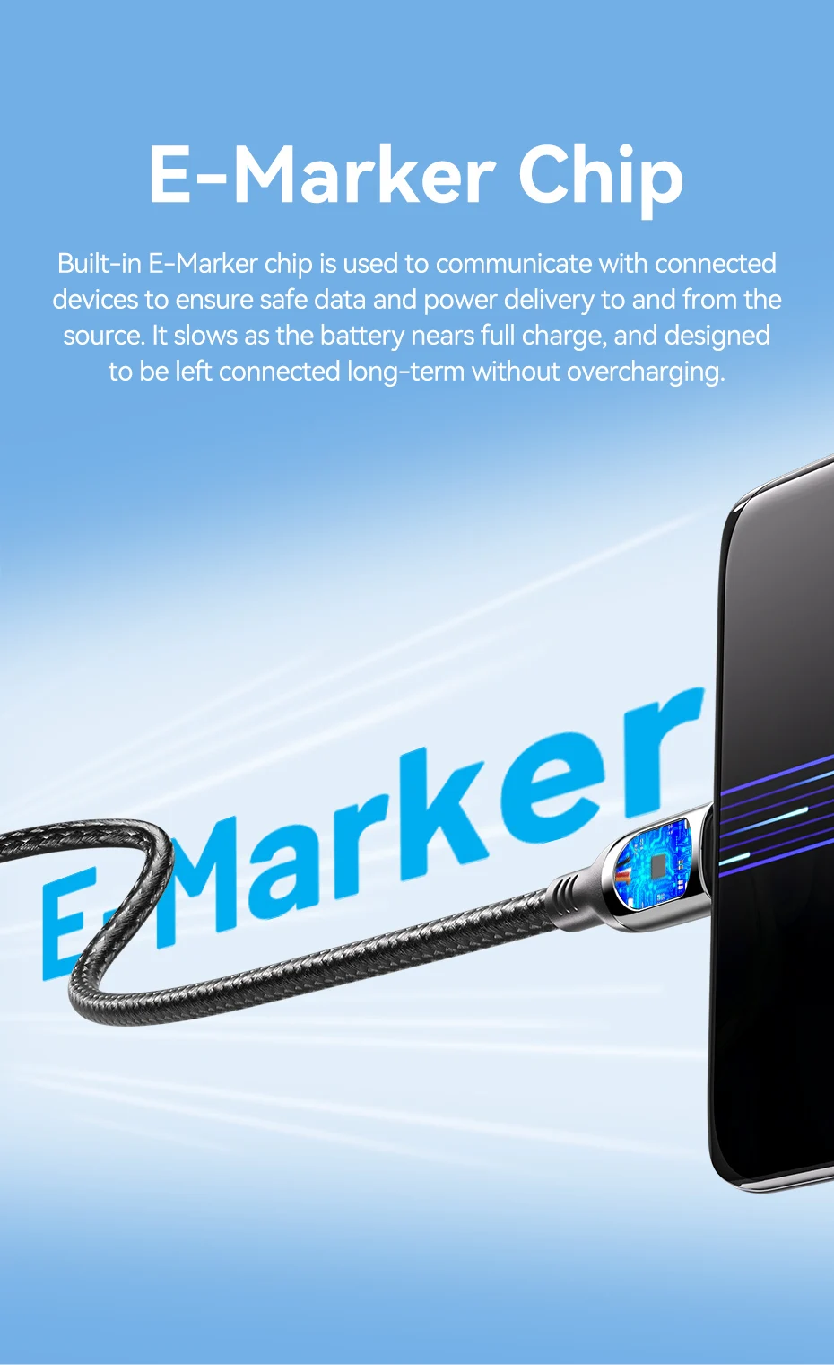 El chip E-Marker incorporado se utiliza para comunicarse con los dispositivos conectados para garantizar la seguridad de los datos y el suministro de energía desde y hacia la fuente. Se ralentiza a medida que la batería se acerca a la carga completa y está diseñado para dejarse conectado a largo plazo sin sobrecarga.