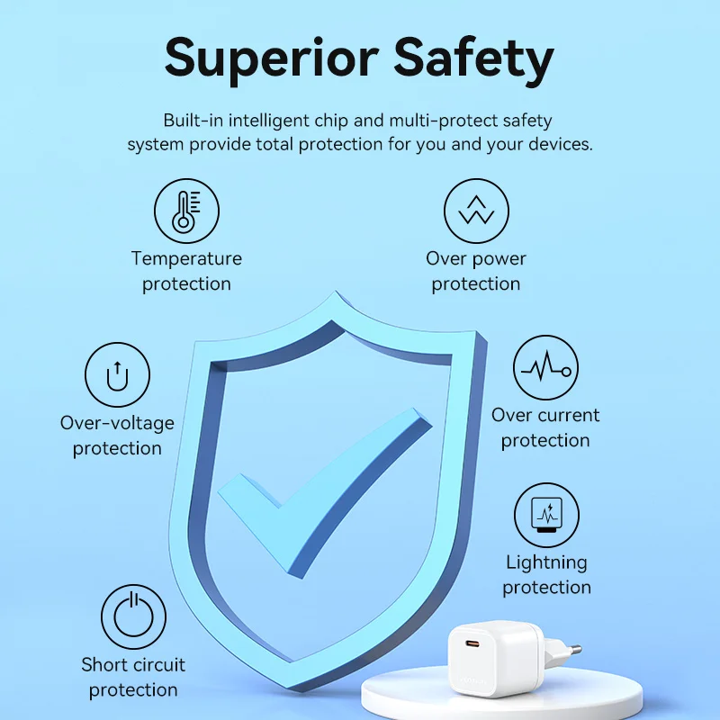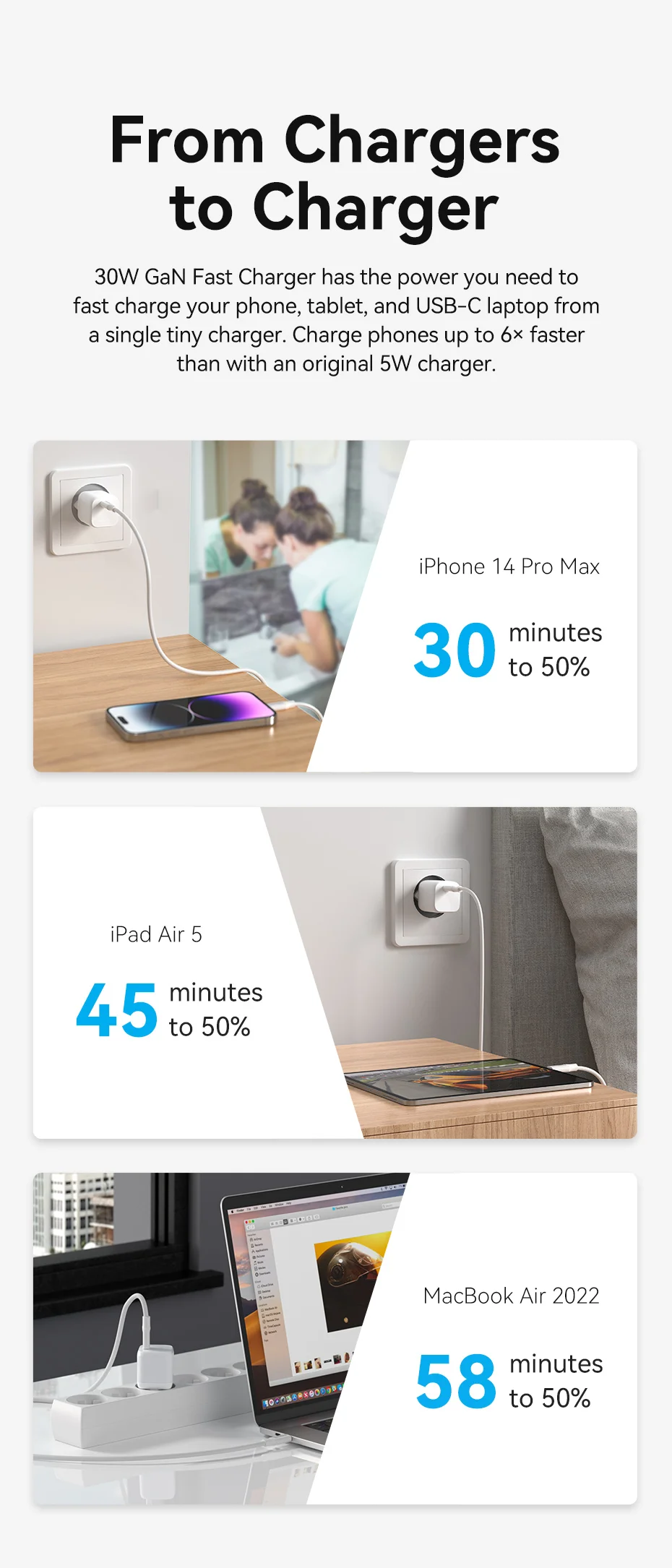 El cargador rápido GaN de 30W tiene la potencia que necesita para cargar rápidamente su teléfono, tableta y USB-C ordenador portátil desde un solo cargador pequeño. Carga teléfonos hasta 6 veces más rápido que con un cargador original de 5W.