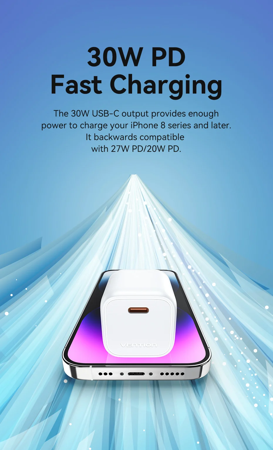 La salida de USB-C de 30W proporciona suficiente energía para cargar la serie iPhone 8 y posteriores. Es compatible con 27W PD/20W PD.