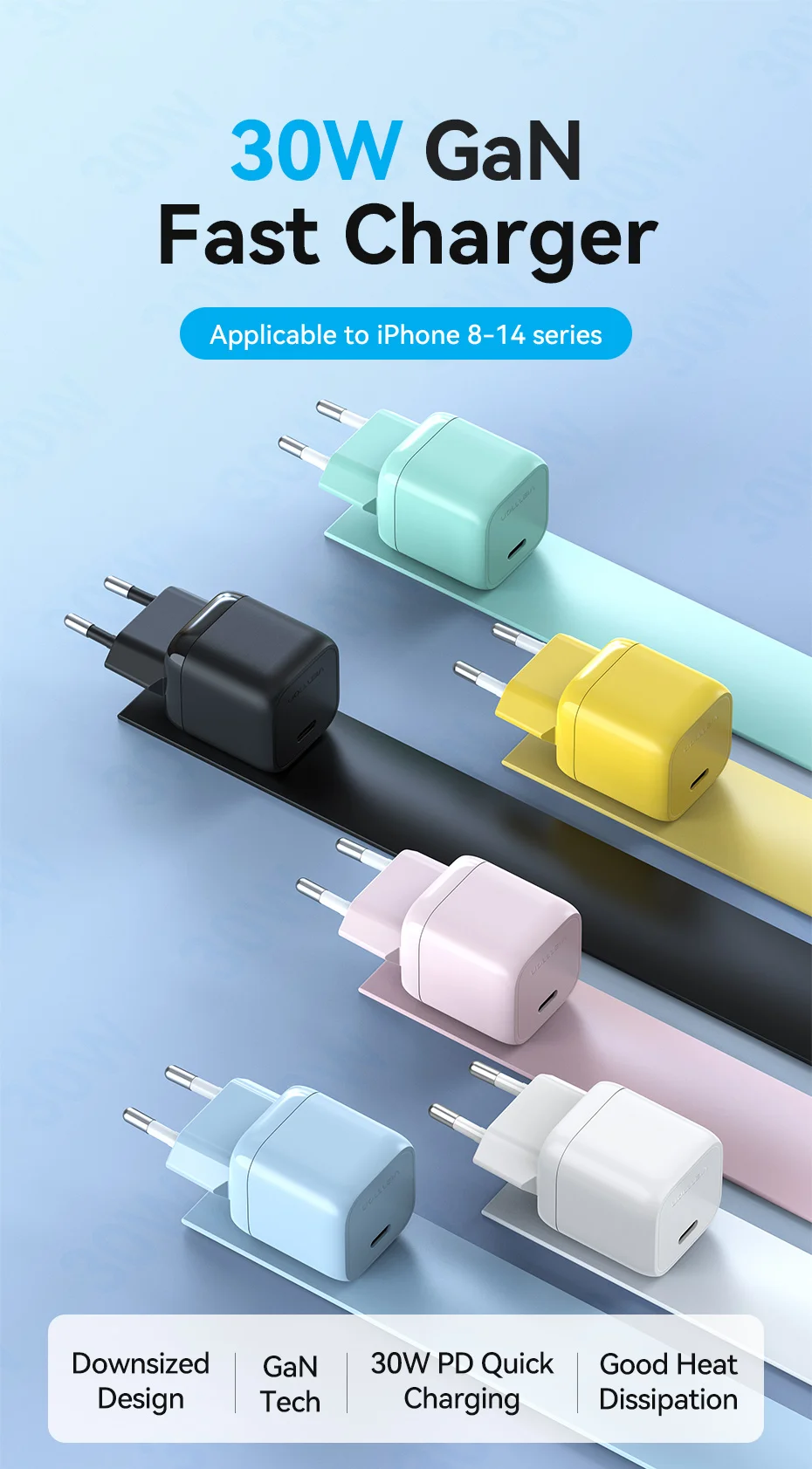 Comprar Vention-cargador GaN de 30W para iPhone 14, 13, 12 Pro Max, USB tipo C, iPad Pro, Xiaomi, Huawei, Samsung, PD